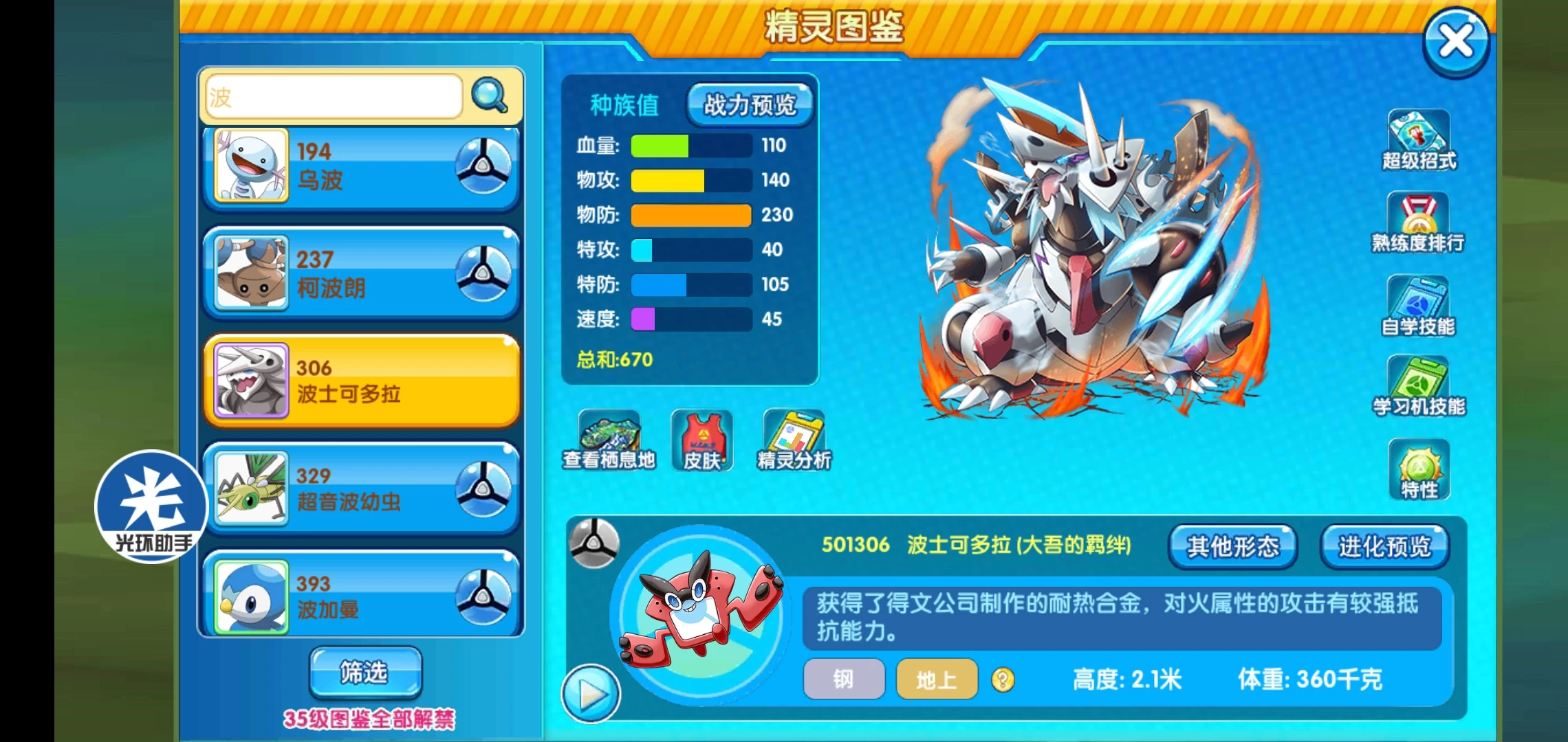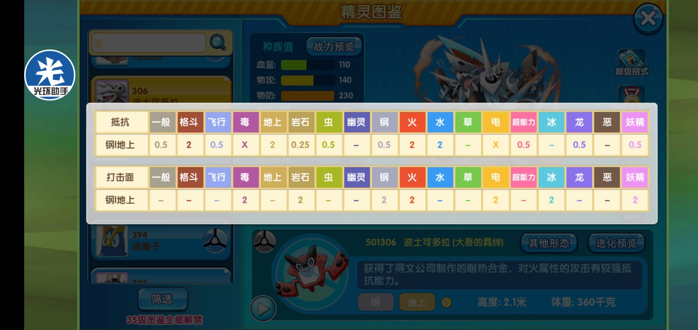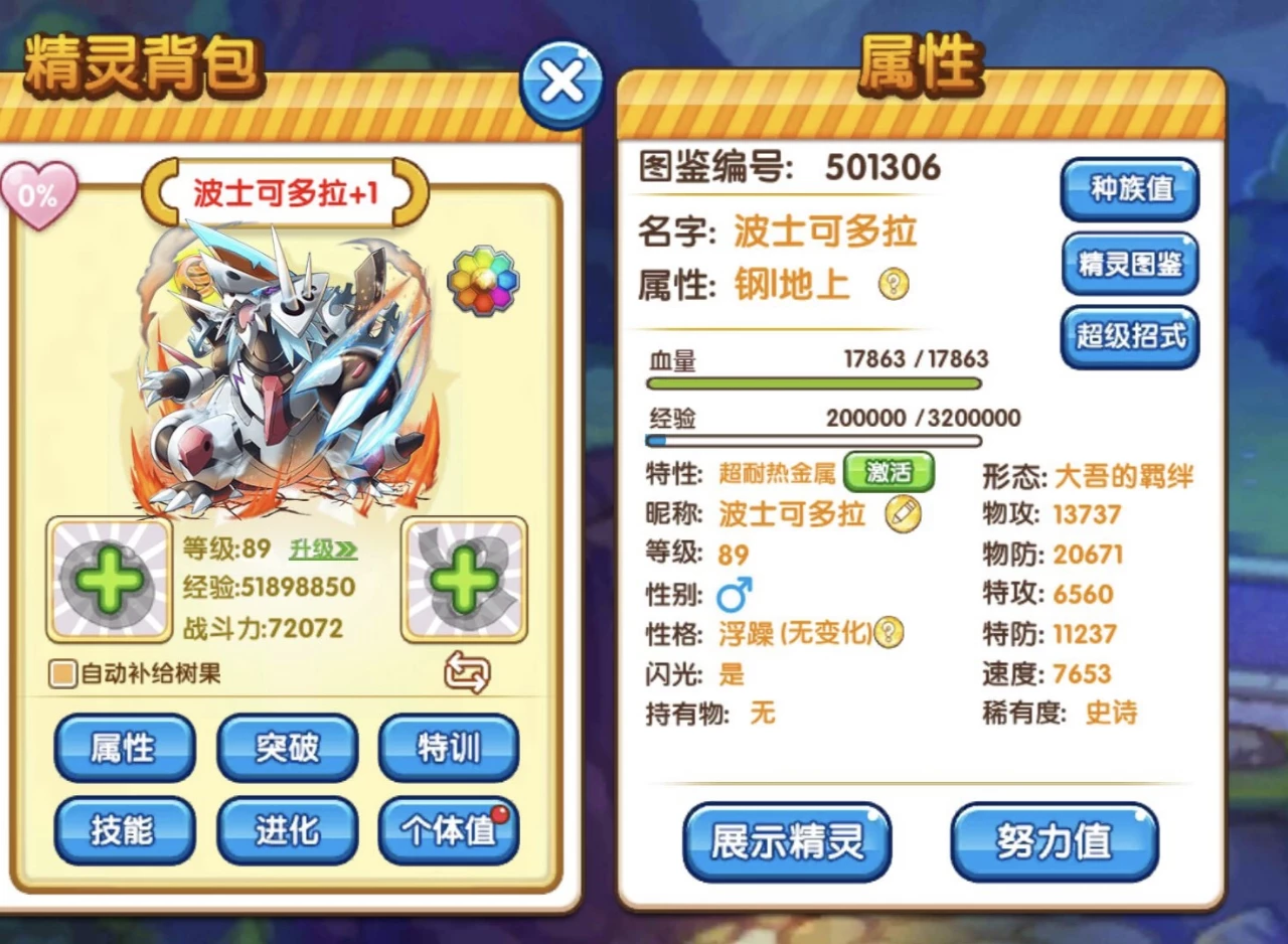 分析:这个货不用想,肯定是个氪金宠,毕竟带上羁绊两字就身价不一样了,本身波士可多拉抗性就很优秀,种族也不差,但最主要的就是缺乏有效的回复手段,其闪光形态就把这个缺点给补充了,所以说仅凭这个可学金属再生就值得氪金,而且其还可以学多种攻击技能,剑舞也可以强化攻击,还有体重减轻,是个提速神技,这就让其作为一个泰坦堡垒攻防两不误,还不怕猛毒的骚扰。强化攻击又或者还是防御盾牌都是强大的存在。