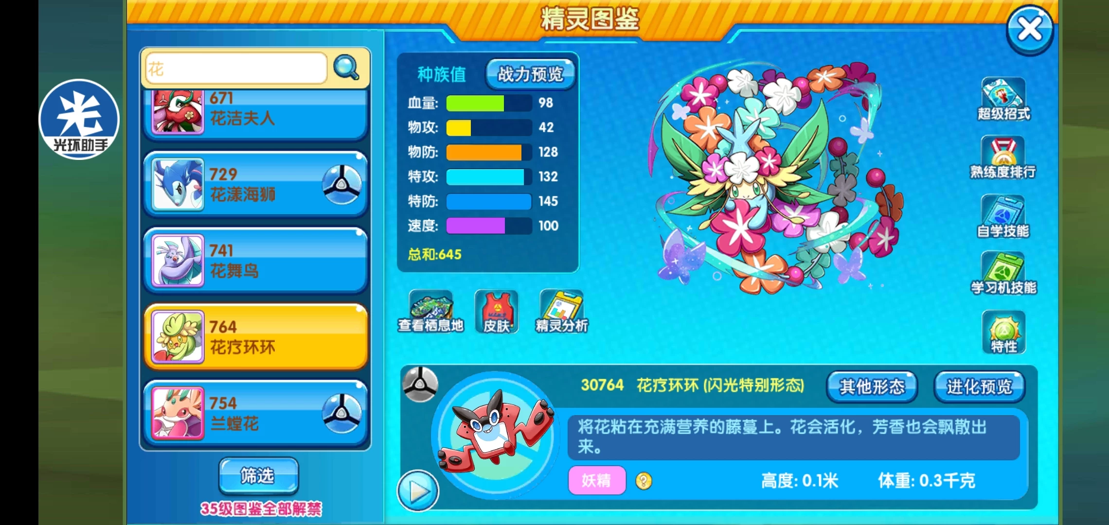 分析:这也是本次更新中的唯一一个辅助队医,单一妖精属性,让其抗性十分优秀,毕竟妖精就两个弱点,而且在当然版本来说毒系和钢系都不算主流,花环抵抗起来也不算太费劲,种族方面速度是弱项,其他防御方面不算太强但也可看。