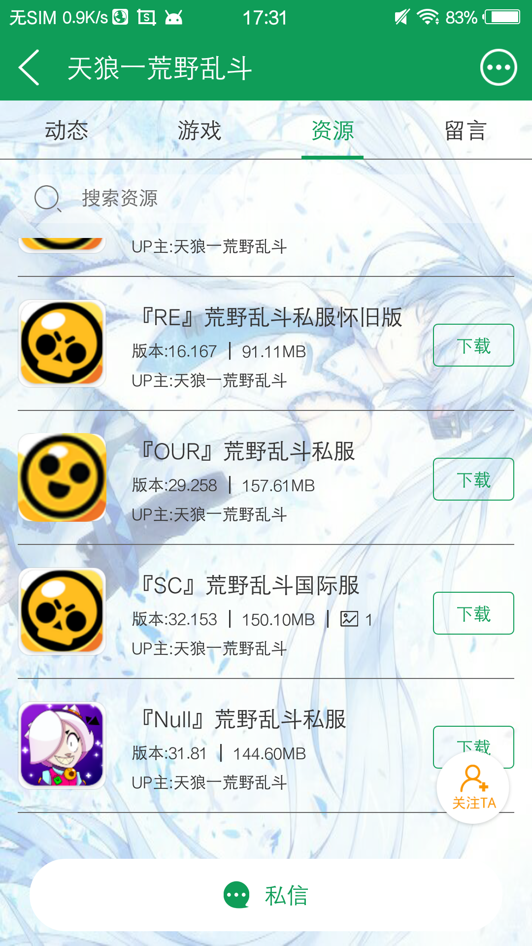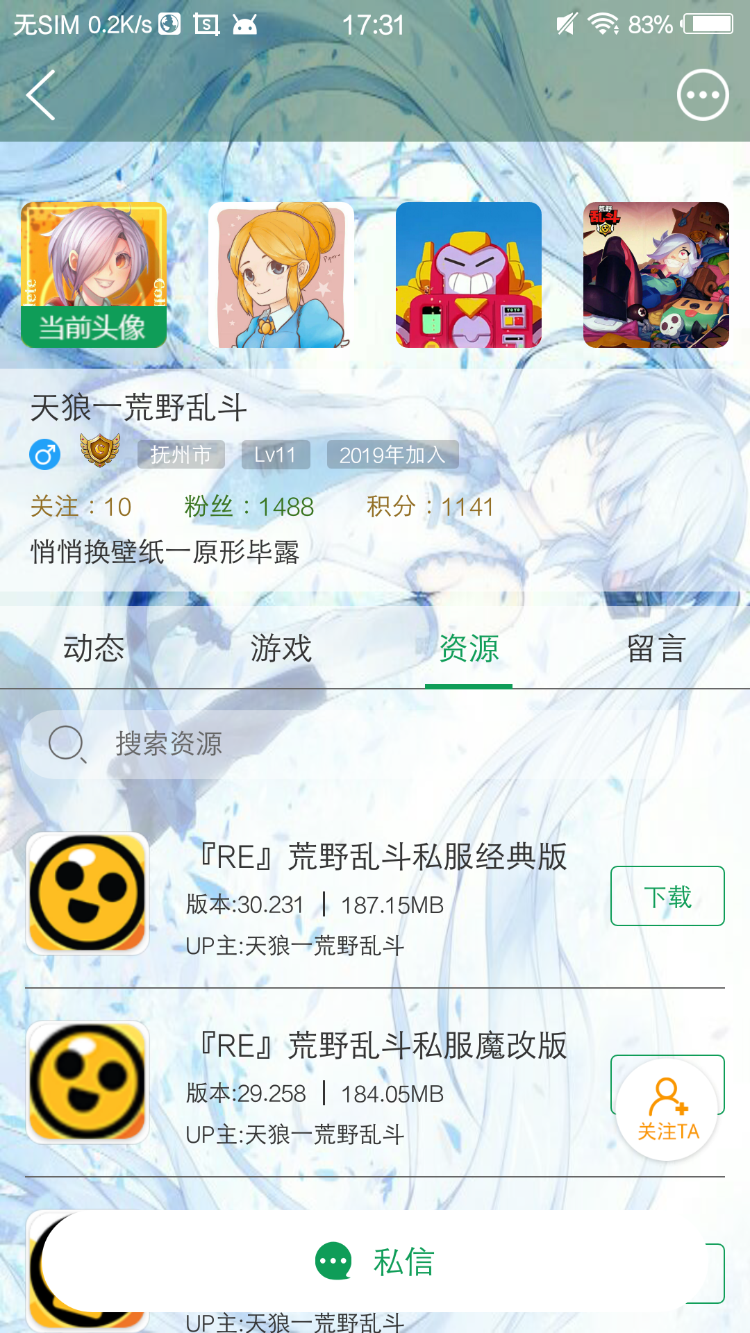 荒野乱斗魔改版来了断定发布于 2021-03-27关注我也不比比了,那些只知道发图片的滚开吧我来发真的。因为我这个红的我忘了是在哪下载的了只能给你们推荐个残破版也差不多就是有的英雄没有。或者本应有的皮肤没有时我也没法。都是真人玩家。首先下载这个游戏盒点进去。搜荒野乱斗,再点用户,点我这个天狼再点资源。下载那个紫色的就行了,其他的都不能玩了。进入游戏后,点商城点第一个和第二个宝箱如果退出去。不要慌,这是真常的,把两个宝箱都来一遍就行了。记住不要点和商城在一起的三个东西的最下面那个里的东西,不然你会卡出去,东西也会重新刷新但英雄和星辉不会。好了快鱼体验吧
