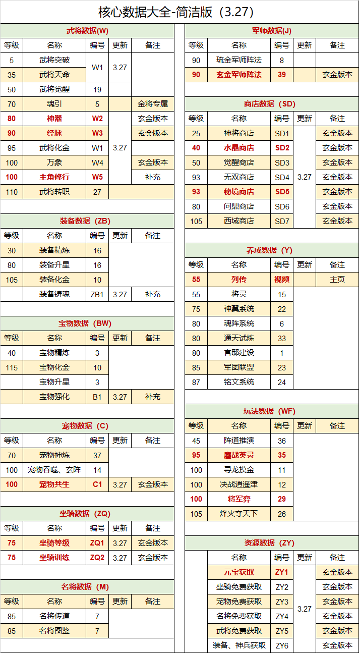 简洁索引帖数据汇总鸢。发布于 2021-03-30关注——— 硬件数据 ———<武将数据W> 【W1数据】武将突破、天命、化金 武将突破天命化金数据 【W2数据】神器——玄金 玄金武将神器数据 【W3数据】经脉 玄金武将经脉数据 【W4数据】万象 万象系统(化神、聚魂)数据 【W5数据】主角修行数据 主角修行古籍消耗数据 <装备数据ZB> 【ZB1数据】装备铸魂 装备铸魂数据 <宝物数据BW> 【BW1数据】宝物强化升级 宝物强化升级数据 <宠物数据C> 【C1数据】玄金宠物共生 玄金宠物共生数据 <坐骑数据ZQ> 【ZQ1数据】坐骑升级 坐骑升级数据 【ZQ2数据】坐骑训练 坐骑训练数据 ——— 商店数据 ——— 【SD1数据】神将商店 神将商店数据 【SD2数据】水晶商店 水晶商店数据 【SD3数据】觉醒商店 六觉消耗数据 【SD4数据】无双商店 真三国无双商店数据 【SD5数据】秘境商店 秘境商店数据 【SD6数据】问鼎商店 问鼎商店数据 【SD7数据】西域商店 西域商店数据 ——— 资源数据 ——— 【ZY1数据】元宝获取 元宝获取攻略 【ZY2数据】坐骑获取 坐骑免费获取 【ZY3数据】宠物获取 宠物免费获取 【ZY4数据】名将数据 名将免费获取 【ZY5数据】武将获取 武将免费获取 【ZY6数据】装备、神兵获取 装备、神兵获取数据