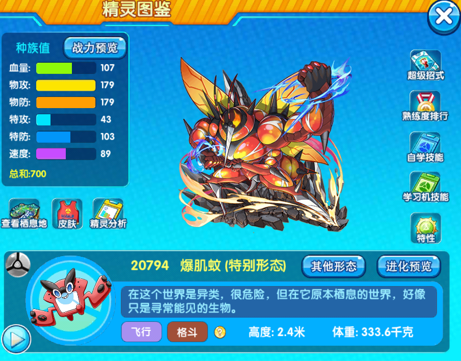 种族值:血量107,物防179,特防103。这直接就有了站撸的资本。如果努力值点上血量,肯定超级肉。然后特攻请忽略,物攻是179,最后那“1针是用来扎你的啦~(开玩笑。速度是89。所以我很拗口。因为八块腹肌也会久久归一,所以89是用来勉励自己的。所以我不会跑得太快,不然吸血多了,也是会胖的啊。看我一身的血红,这是营养爆炸的象征,所以我得少吸点血了。最近吸了一只倒霉的卡比兽,导致我飞的有点慢了