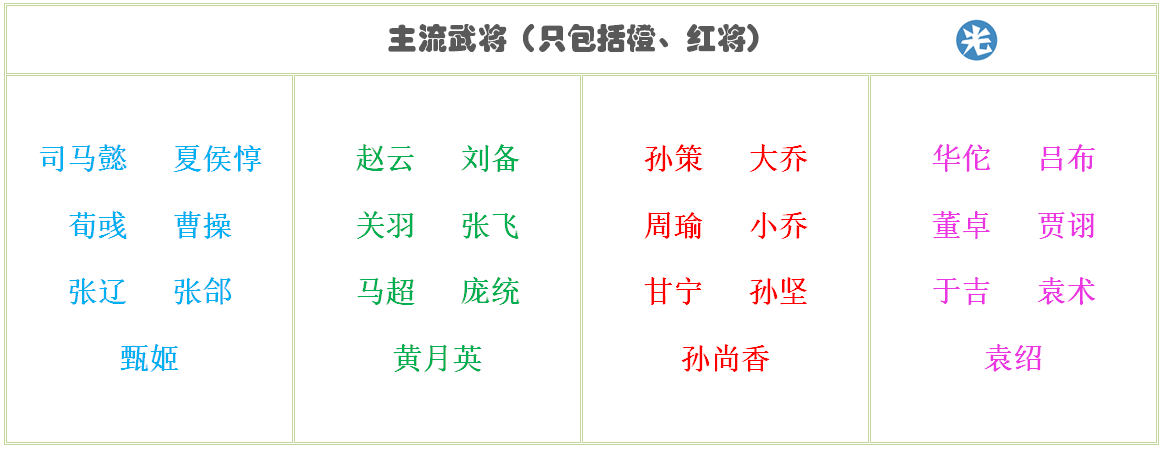 下面主要结合正反面,随便选用几个武将作为例子,以老哥的理解角度,去说说一个武将自身的定位和亮点特性,始终围绕
