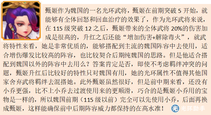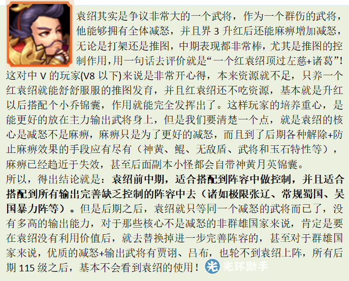 2、光环辅助武将通常指:小乔、张郃、庞统、月英、袁术这五个;他们的特点就是有着回怒气+全体属性战力加成的同时,还非常适合在不同国家的阵容中去混搭使用,并且光环武将对于装备、宝物、锦囊等资源需求不是很高,仅仅武将突破等级跟得上就有着不错的收益!