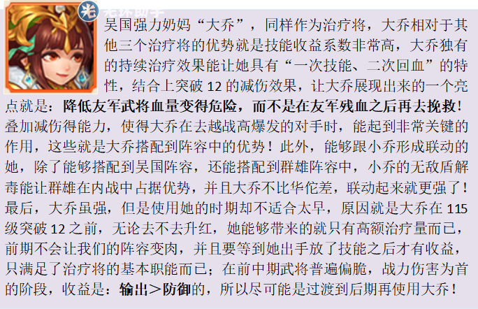5、奶将跟肉盾将在游戏内就只有4个,通常来说奶将都是要配合减伤型阵容去用(如蜀国铁桶阵、火毒阵、减伤群雄阵等),并且到了后面桃园结义锦囊满了、再搭配好的玄武玉石,在阵容中就能起到非常不错的收益;前中期110级而言,其实是不适合玩奶将的,这种拼战力的时期玩光环武将的收益会更大。正常情况下,奶将和肉盾将选择一个就行了,但是大后期也有一些节奏非常能拖的阵容,一些国家会两个都用上,但是吴国的大乔+孙坚就不建议同时上!