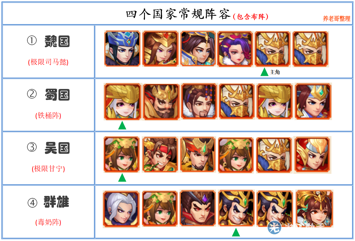 1魏国 > 3吴国 > 2蜀国 > 4群雄;但是,这里面没有任何一套阵容,是能够去完虐另外三套阵容的,就是因为阵容之间存在着针对克制,下面从四套阵容的角度出发,分析一下优势和短处: