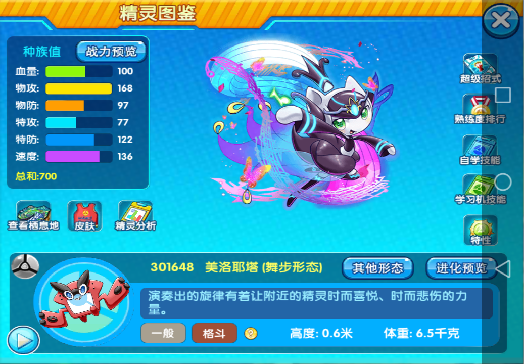 这个形态是美洛耶塔的舞步形态,属性方面有了改变,把超能替换成了格斗,但是弱点不多,也不少,速度方面也是很给力的,目前的玩法就是依靠自信过剩,打收割为主,不过,他现在的环境也比较差,就是因为自身的属性问题吧,再加上现在的精灵都比较肉,也限制了他的输出能力,所以说,不是特别的强,也不是特别的弱,属于前期的宠物。