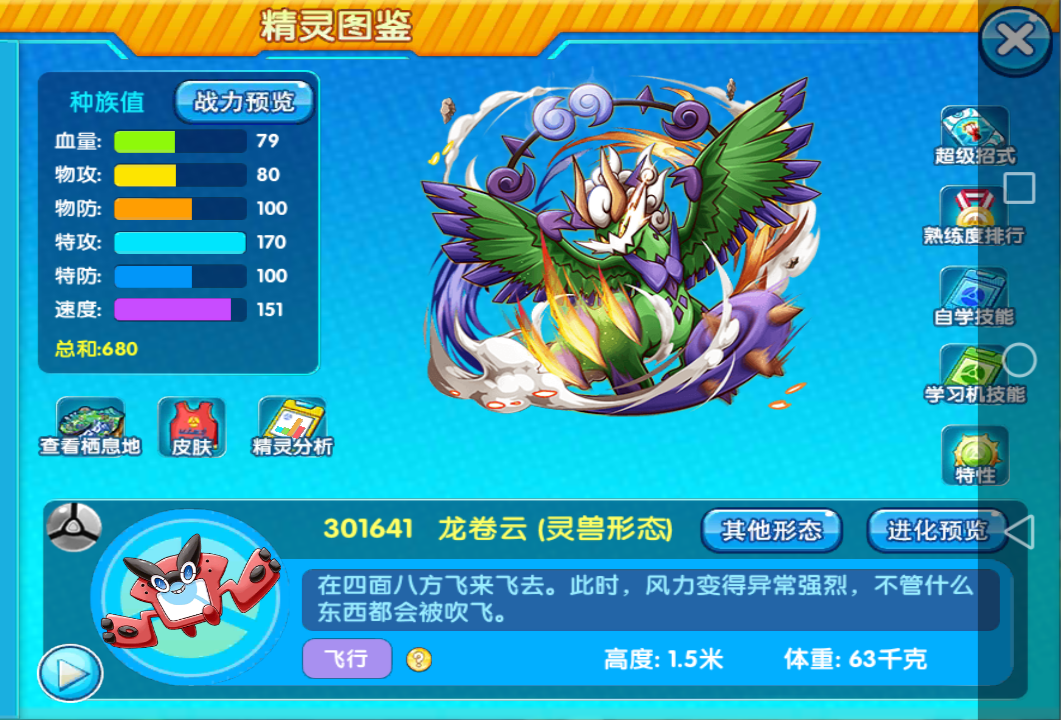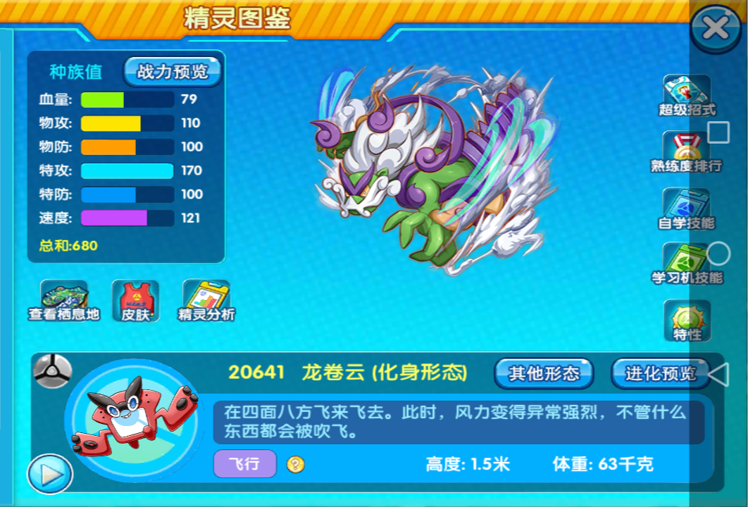 这是龙卷云的神兽形态,速度和攻击力都比较给力,但是特性却是一个再生力,这让它的种族面板显得十分的尴尬,因为一般拥有的再生力特性的精灵,都是比较肉的存在,而他是一个例外,速度挺优秀的,但是防御力却非常的低,所以让他处于一种非常尴尬的环境下,主要就是因为防御力太低了,根本扛不了什么伤害,所以现在的环境也是比较冷门的。