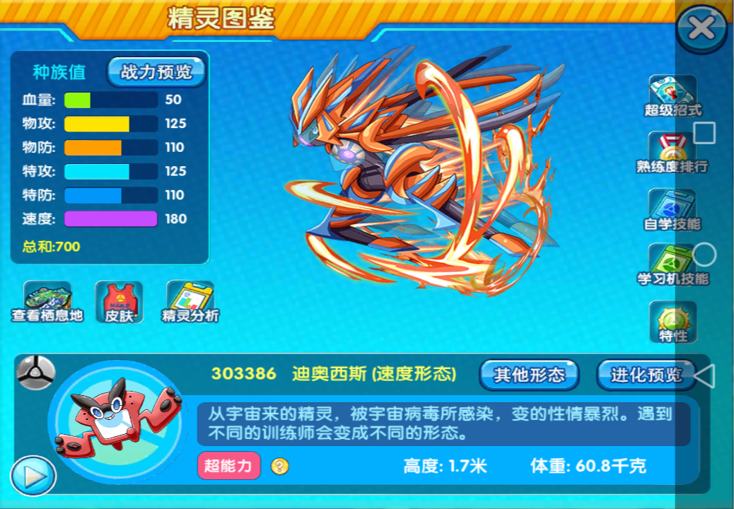 这个形态是外星人速度最快的一个,也是这款游戏里面速度第一的,除非是极限加速的z神,才有机会快得过,否则没有一个精灵可以快得过他,不过这个精灵快是挺快的,就是防御力还有输出能力基本上是没有,属于一个比较没有用的种族搭配,再加上现在的环境速度快,并没有什么太大的作用了,所以这个形态的外星人也慢慢的退出了PVP的战场,目前只是一个仓库的宠物,但是也是可以玩的,依靠自身的速度线,可以先手挑拨然后走气压消耗流还是很不错的。