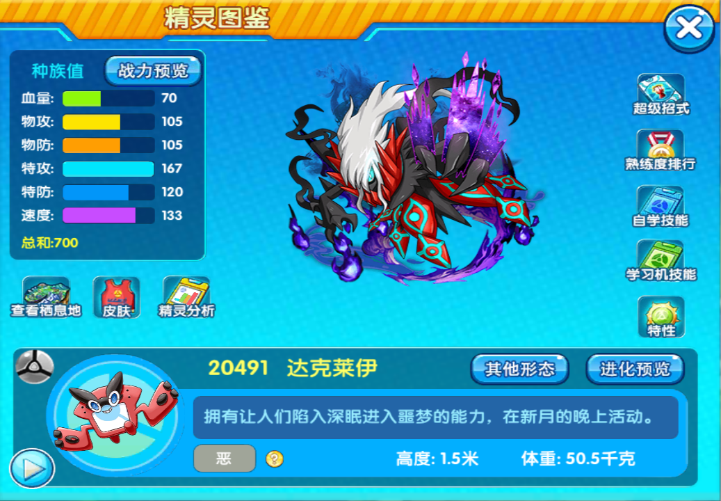 达克莱伊也叫噩梦神,是比较早的,超进化精灵之一,现在吗?非常的冷门,主要就是达克莱伊,它的主要推动能力就是依靠催眠,专属技能黑洞可以达到80%的命中率,然后再依靠噩梦特性,进行消耗的一种打法,同时自身也能够依靠诡计强化,这是他的以前的主要打法