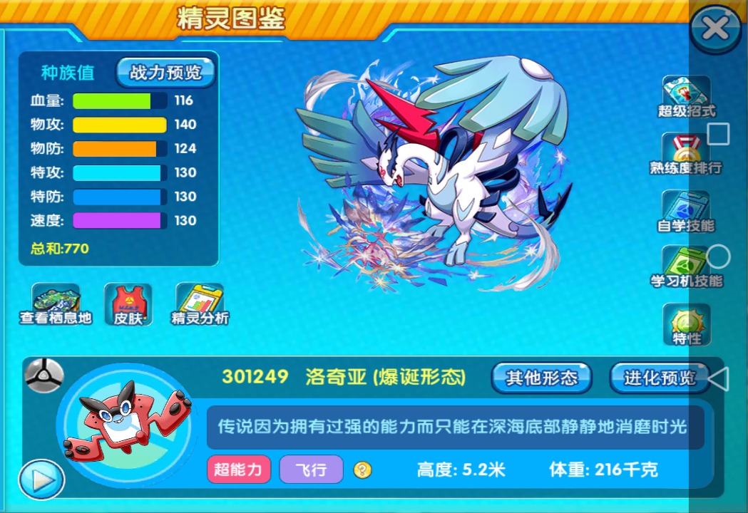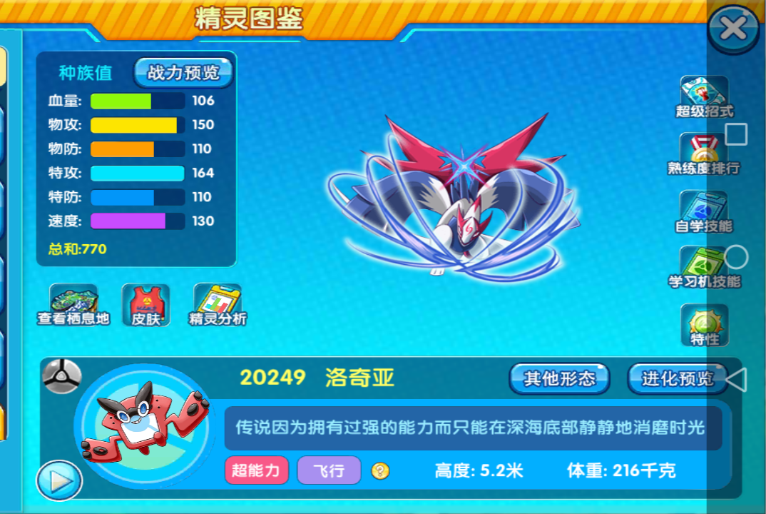 这是洛奇亚的另外一种形态,从面板看,更接近于水桶腰,说白了,这已经是一个水桶腰面板的精灵,这让他的输出能力非常的尴尬,如果走开朗输出,当然是没有问题的,只是飞行物攻,技能比较少,而且要么就是命中率不高,要么就是有副作用,如果走胆小输出那么,他这个物攻种族就要会浪费,所以说这让它的环境以及能力显得十分的尴尬,我个人给这个形态的评价,就是史上最弱转换形态,闪光的还算是比较不错,高伤害高速度,只能期待未来再次加强了,要不然的话,这两种形态的洛奇亚都比较冷门。