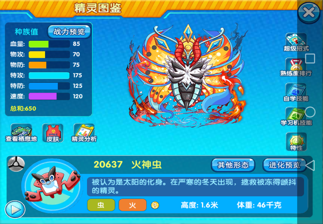 这是火神虫的普通形态,从面板上来看,属于速度有些慢但是特攻,却非常的不错,而且拥有魔法防御特性,让它免疫所有的间接伤害,就算场上有钉子,也是不怕的而且也能够通过蝶舞进行强化,可以说是非常不错的一个小精灵,但是随着后来版本更新针对性的宠物越来越多,让他的环境得到了下降但是他的输出能力还有辅助能力还是挺不错的,只是看玩家们愿不愿意玩了。