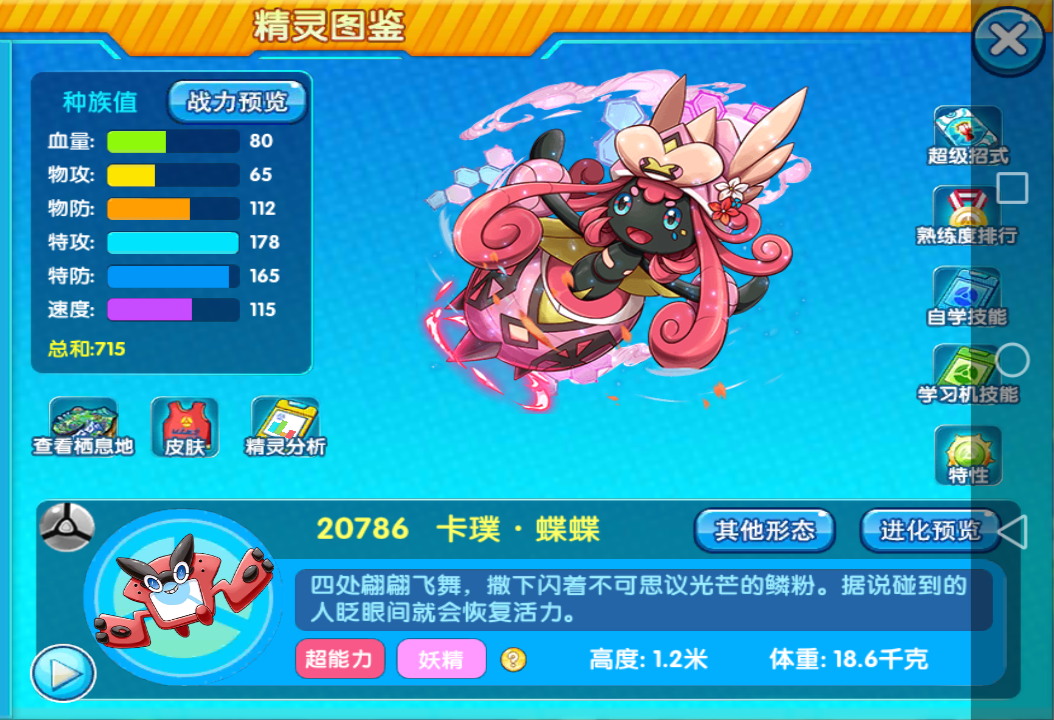这是卡普家族可以在狩猎场抓到的精灵之一,从属性上面来看,还算是不错的,特性是精神制造者,可以让超能属性的技能威力提升1.5倍,这个提升让他属于一个输出手,但是,目前的环境刚属性比较多,所以说,他的输出能力是非常的低,所以目前还是比较冷门的存在,但是他还有另外一个非常强大的输出特性,就是未来攻击,但是有个缺点,就是遇到恶属性就会失去效果,所以说这两个特性,都是没有什么实际作用的,所以说还是冷门