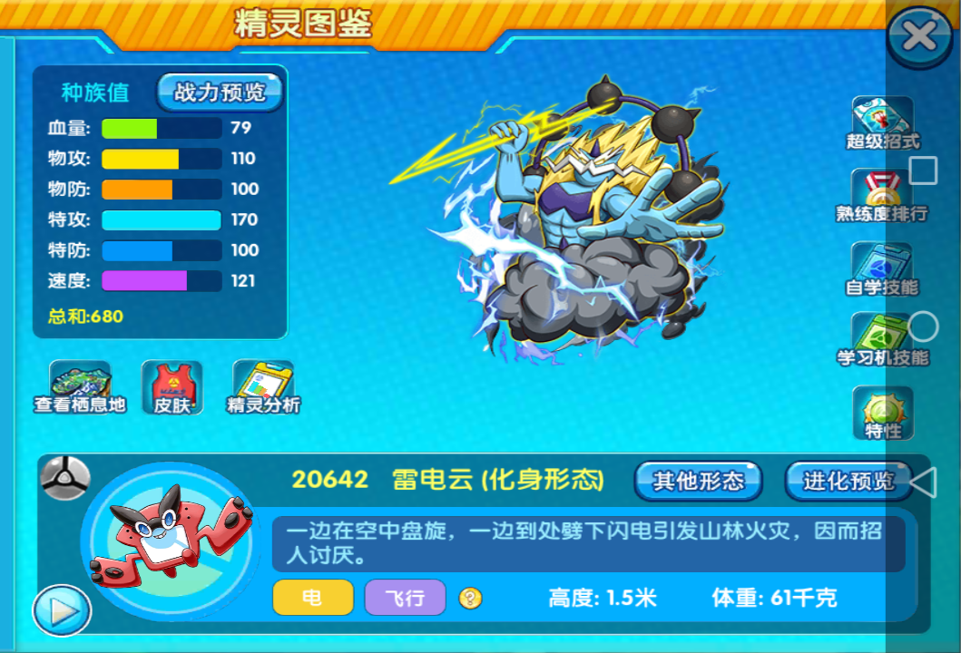 但是他也可以进行输出,拥有强运特性,配合对焦镜片可以拥有50%的暴击概率,我与说在输出方面还是有些优势的,最大的缺点就是速度,所以让化身形态的雷电云,一直处于冷门的阶段,并不是很热门的精灵