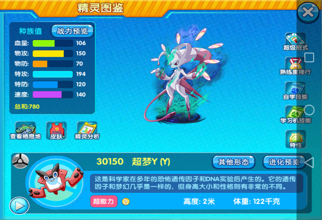 超梦y是超梦第一种形态,是比较早的,超进化精灵之一也曾经是国家队精灵之一,自身的速度非常的快,再加上拥有紧张感特性,让他成为了风靡一时的紧张感,猛毒流的始祖之一也可以紧张感搭配鬼火,由于自身还可以使用挑拨,所以说也是一个非常完美的控场手,但是自身的属性非常之尴尬,所以到了后面超梦的环境越来越差,直到现在这个形态基本上是无人问津了。
