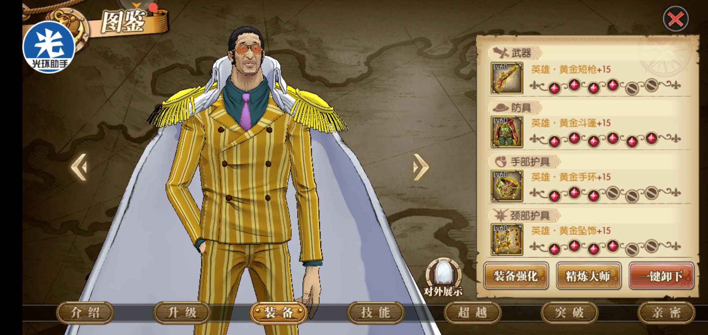 这种黄金套的战力很虚不过 没有附魂也有50+w 曾经附过全部金色 大概有80+w的这种战力 很虚 能出手就有爆炸输出 这种适合用于过图卡主线的人 双蛇就可以用黄猿来秒青蛇来过 前期和鹰眼双线推土机很实用 我走的是纯输出