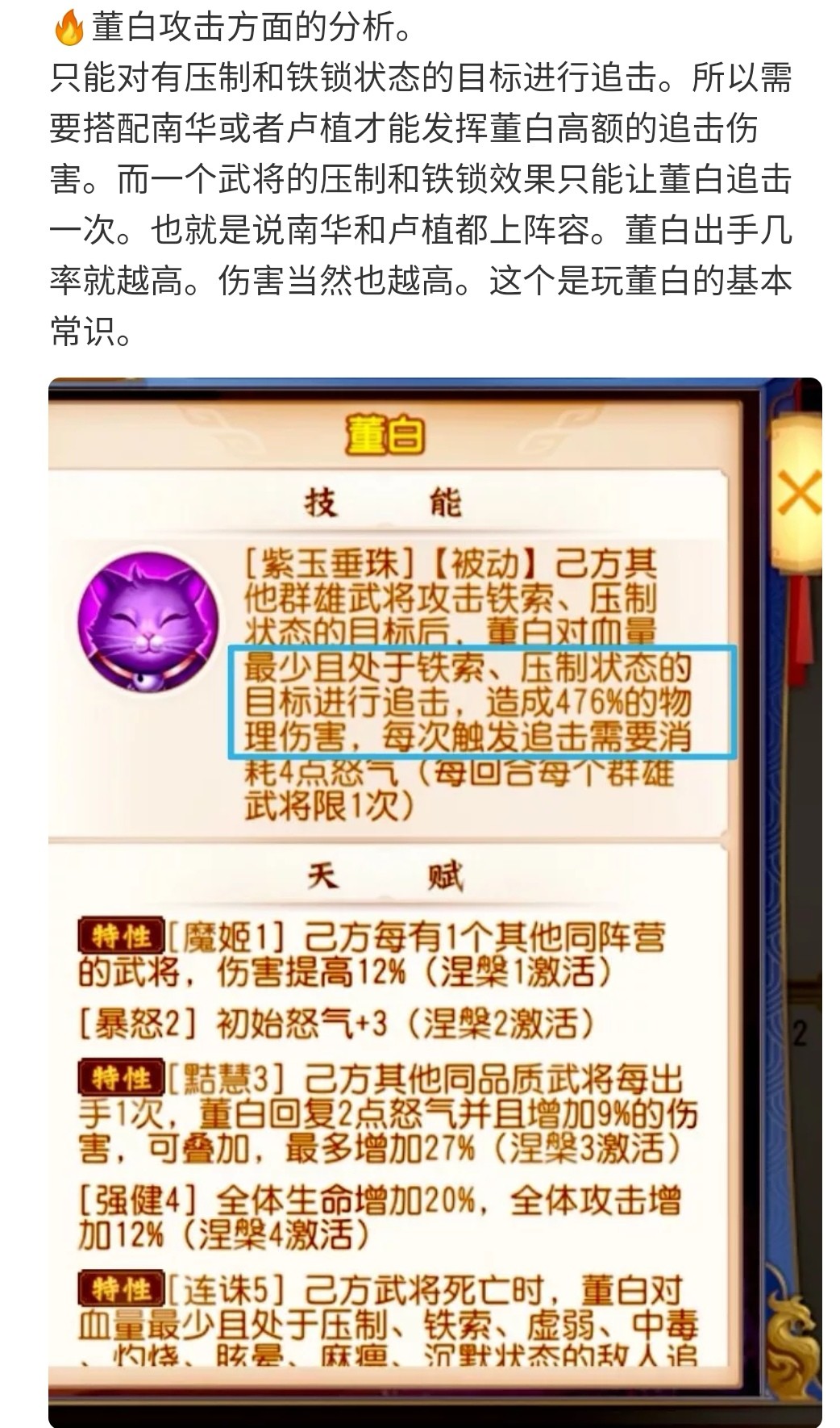 👹第三梯队。周姬。水镜。子上。董白。说一下子上。一般都会选择搭配司马懿。不建议单输出子上。而董白更是需要南华或者卢植去触发董白去追击。选择培养董白。等于需要培养2到3个金将。资源要求非常高。