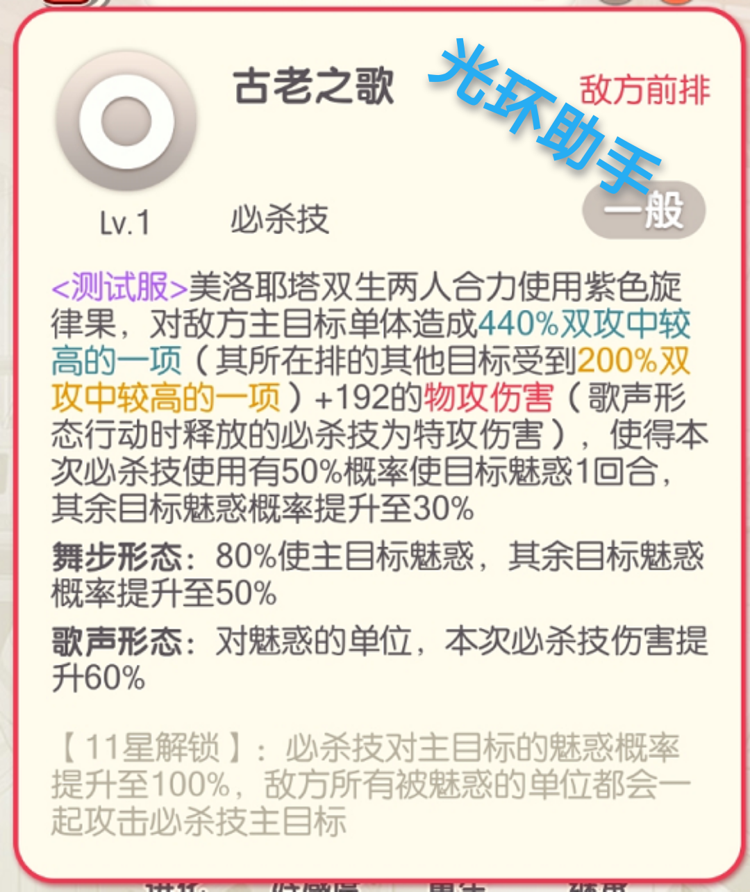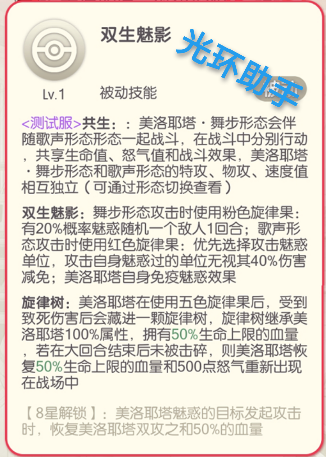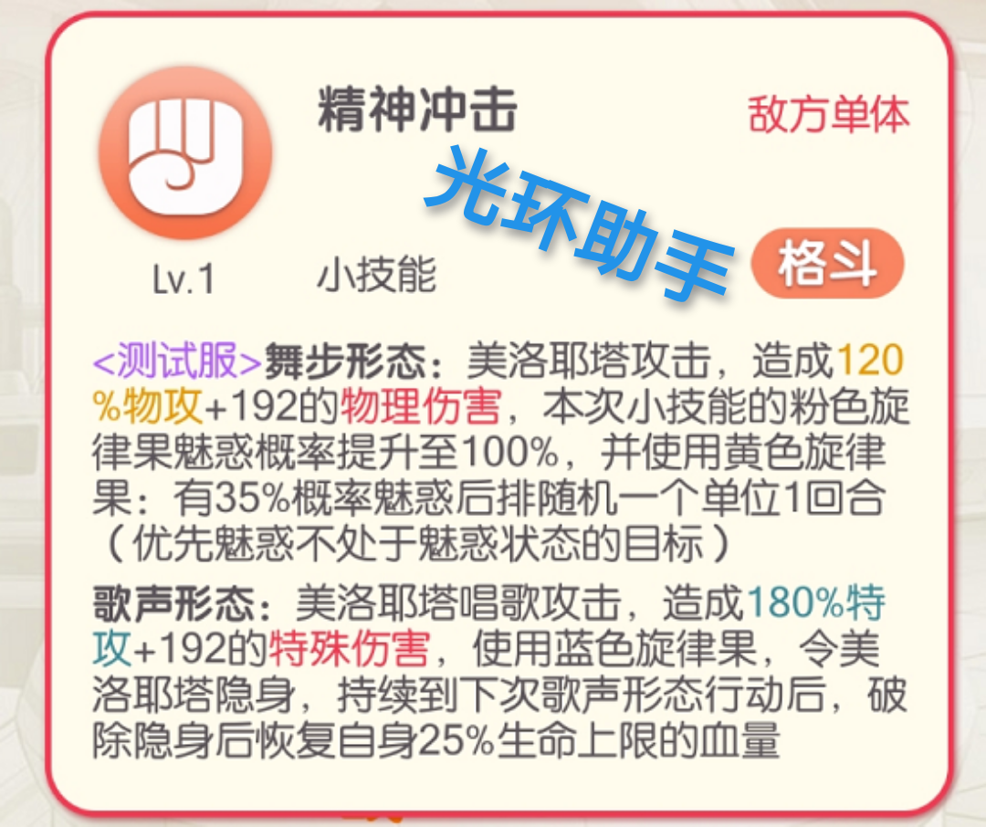美洛耶塔在使用5色旋律果后,受到致命伤害会藏进旋律树,旋律树继承美洛耶塔100%的属性和50%的生命,未在大回合被击碎,光环攻略组出品,则将复活拥有50%的生命和500点怒气。5色旋律果,舞步形态攻击自带粉色、歌声形态攻击自带红色、2技能舞步形态攻击使用黄色、2技能歌声形态攻击使用蓝色,大招为紫色,即第1回合均使用2技能,2回合舞步形态使用大招后即可获得可复活状态,目前并不知道旋律数原理是否能被反复激活。二、技能