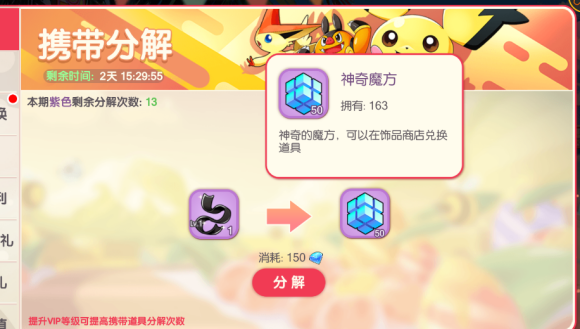 每个紫色携带可以分解成50个神奇魔方,神奇魔方可以用来兑换其他道具,每次兑换150钻石。
