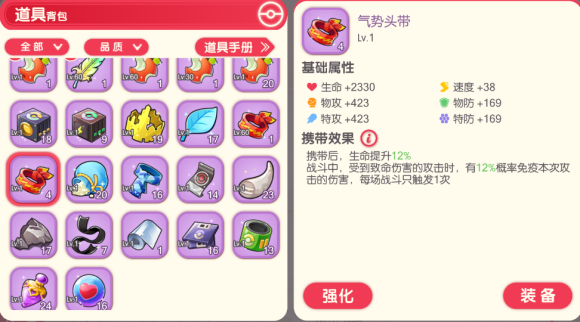 气势头带:+7有33%概率免疫一次伤害。部分情况下有奇效的一个携带,比如冒险295关,或者是给闪电鸟、白龙之类的也可以。