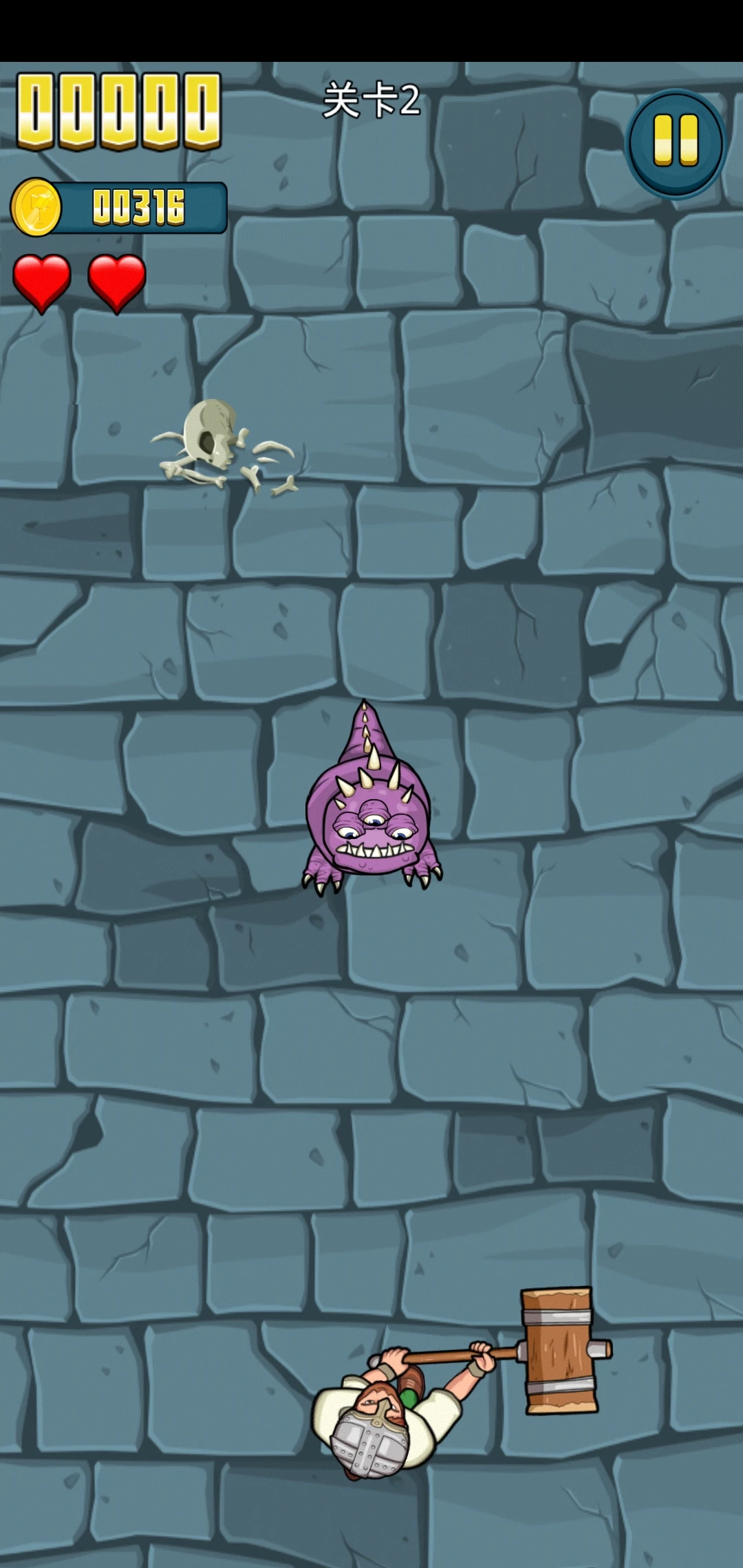 想要干掉怪物,玩家要注意好挥动锤子的角度和距离,离得太远了,可能不能完全打倒面前的怪物导致角色被怪物攻击;离得太近了,还没来得及挥动锤子就已经被怪物攻击了。角色的生命是有限的,因此,不能受到怪物太多的攻击。想要尽快清除场景中的怪物,就更应该要注意角度了,如果角度选得好,利用连锁反应,场景中的怪物一下子就可以被清干净了。