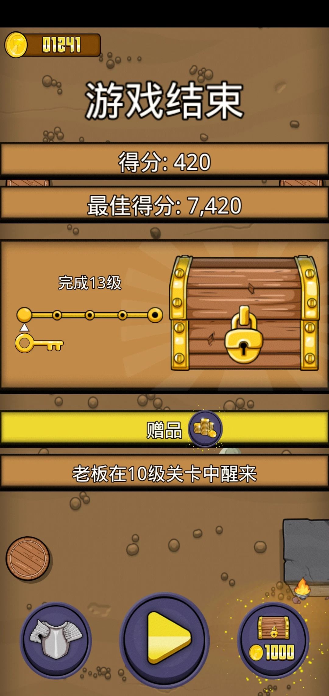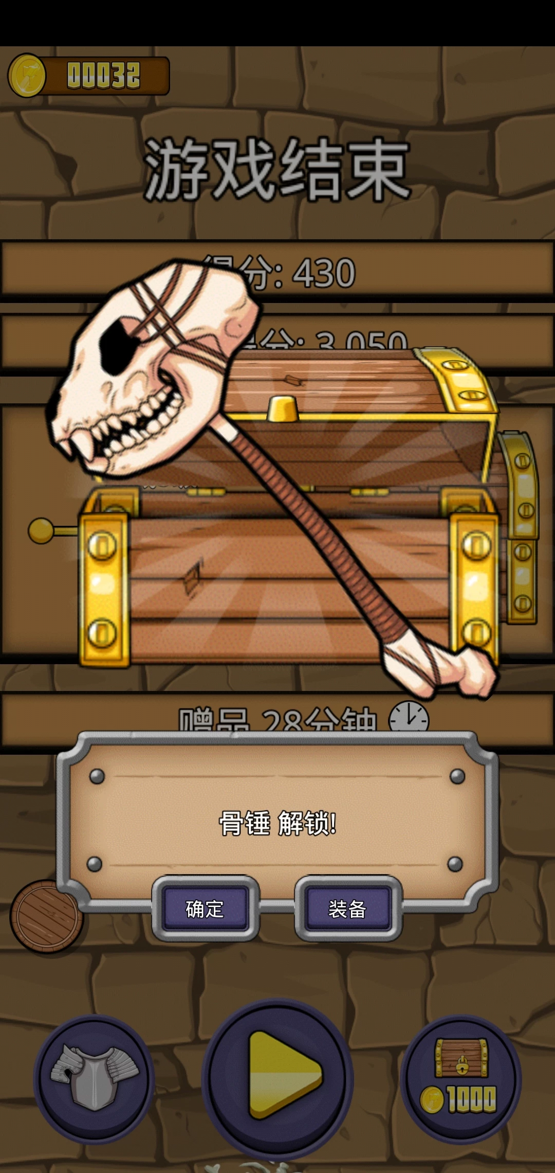 游戏结束之后,会弹出一个有宝箱的页面,你可以看到你这一关的得分以及最佳得分。中间的宝箱是需要通过关卡才能开启的,如果五个关卡都通过了,那么宝箱就会开启,有可能会出现锤子、头盔、戒指或者盔甲。