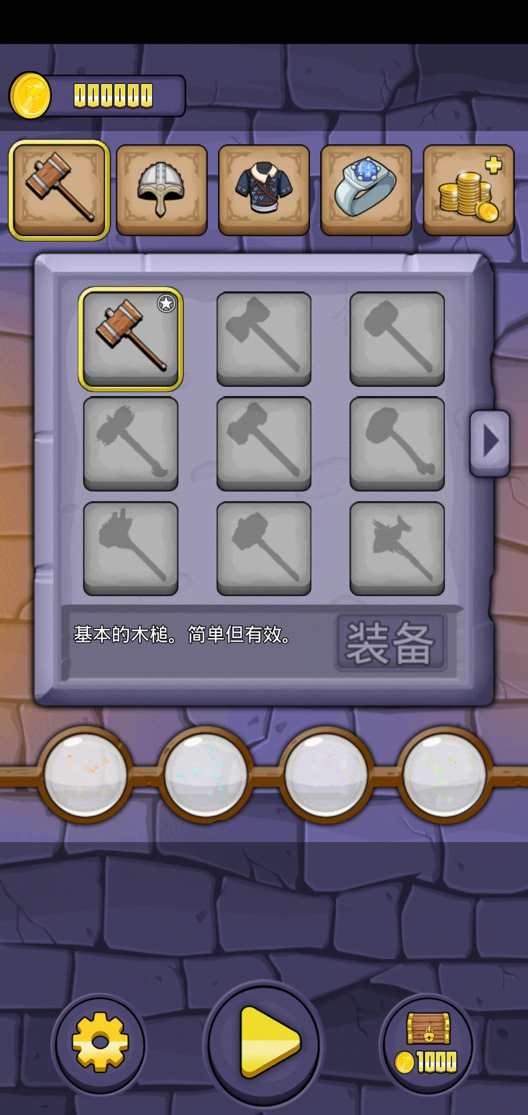 当然,如果不想能过关才开宝箱的话,那么当你储存了足够多的金币,点击右下角,也是可以用金币来开宝箱的,1000个金币一次。点击左下角“盔甲”的按钮,玩家可以更换身上的装备。装备的样式是非常多的,在这里,你可以换上怪诞的锤子,特别的头盔,奇怪的服装以及精致的戒指。不过这些装备都是要通过解锁宝箱来获得的,只有尽力通关才能解锁更多不同的装备。