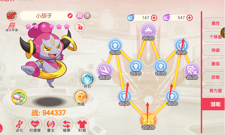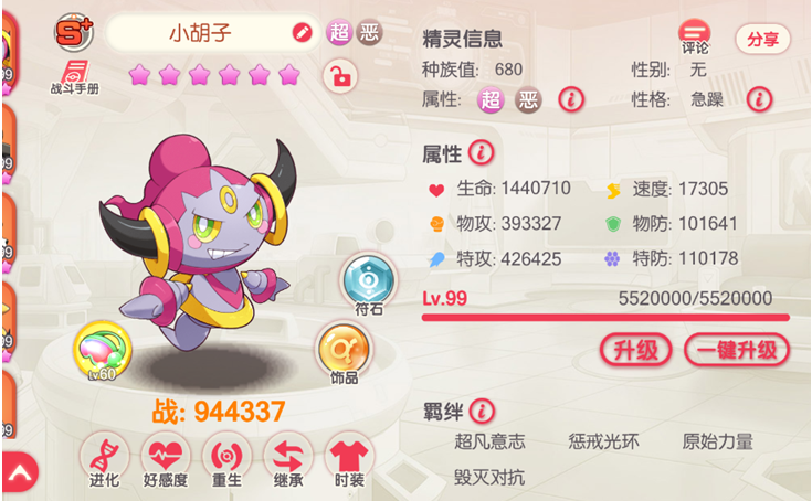 胡帕的性格推荐是急躁、天真。胡帕是目前S精灵中双攻最高的精灵。虽然是特攻精灵的,但是必杀效果有100%物攻伤害的真伤,所以胡帕的性格不推荐降攻击。