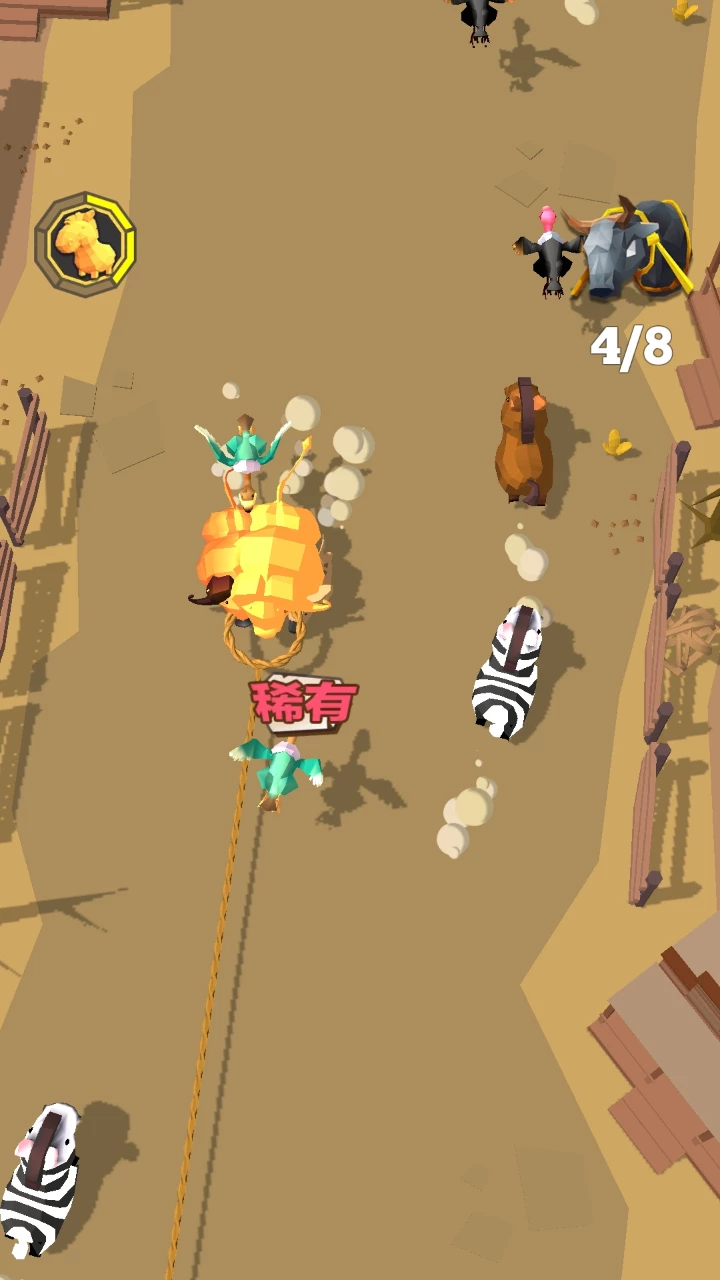 这一款的游戏的核心玩法主要可以分为两个部分,第一个部分是休闲跑酷玩法,正如它的名字一般玩家化身为牛仔,在野性十足的荒漠峡谷之中甩出自己手中的绳索套取沿途奔驰的动物,这些动物可以给角色带来一定的金钱收入。