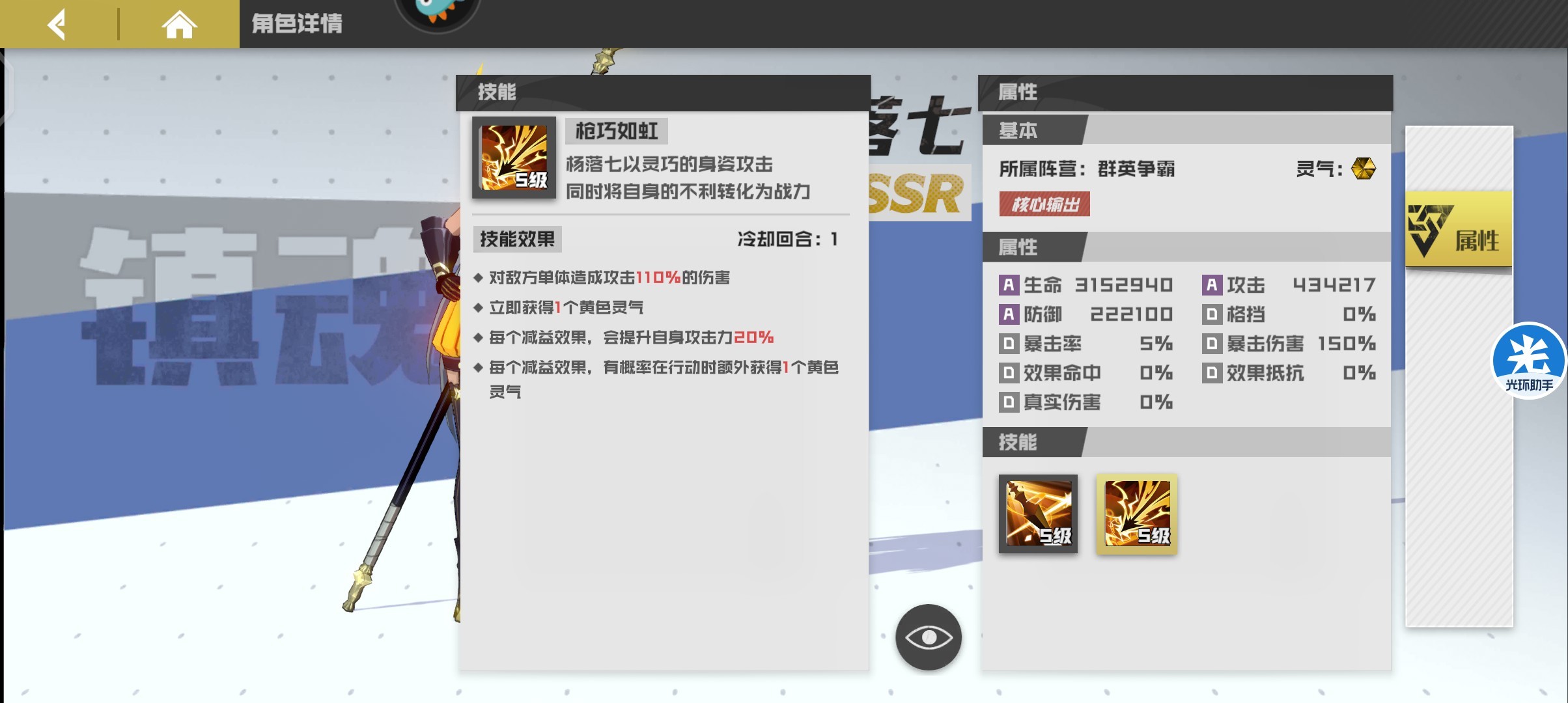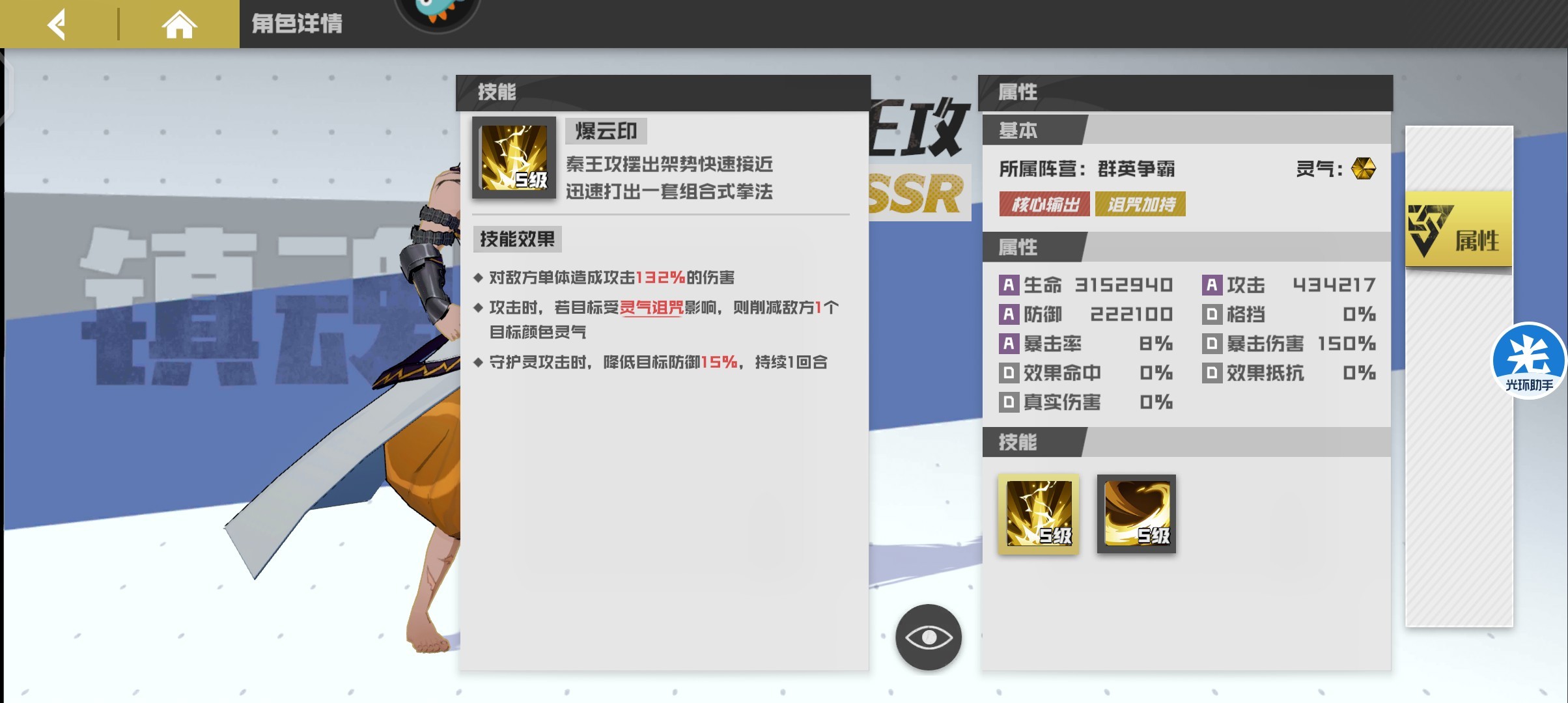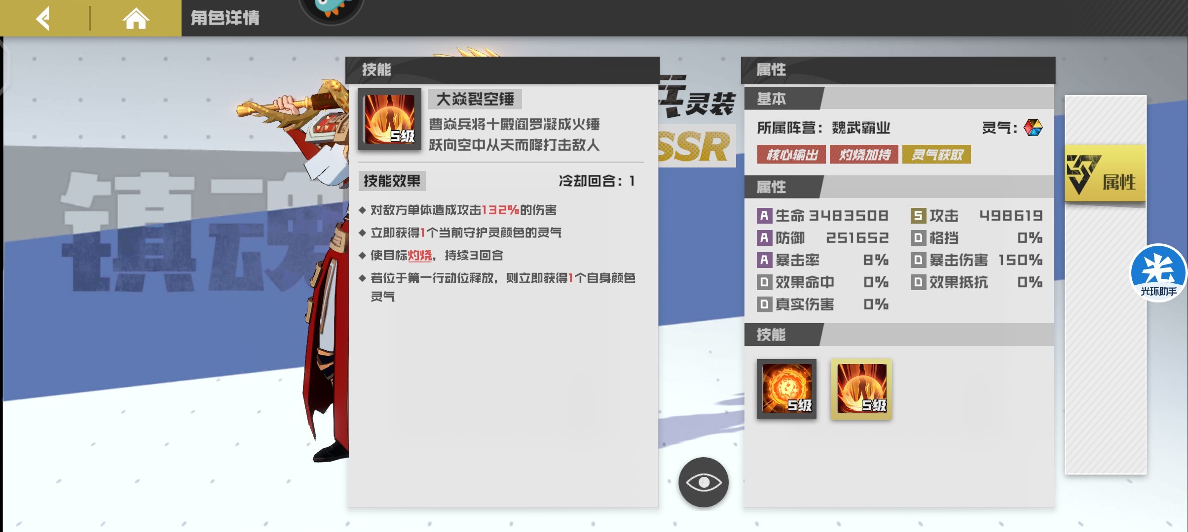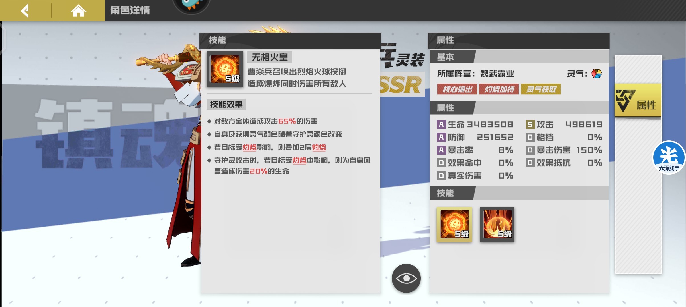 平民首选ssr寄灵人,等级任务以及登录赠送,势力商店可购买,拥有全体伤害技能且可以对敌方全体施加灼烧效果,与曹焱兵搭配造成全体灼烧效果