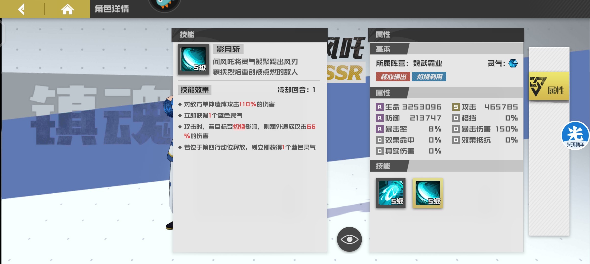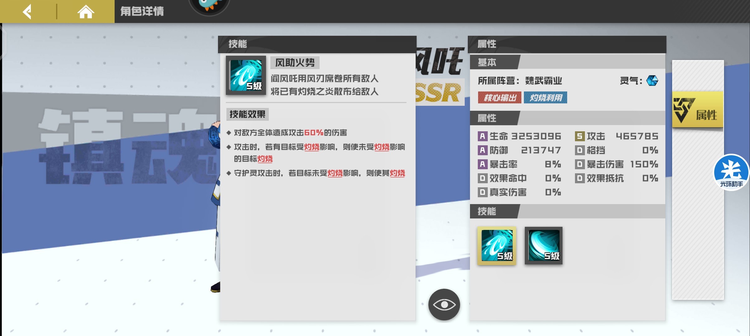 为守护灵增加的技能效果对灼烧单位攻击回复造成伤害百分比血量弥补了守护灵缺乏续航的能力。1技能起手可以配合阎风吒挂火,再使用2技能可对敌方全体施加3层灼烧