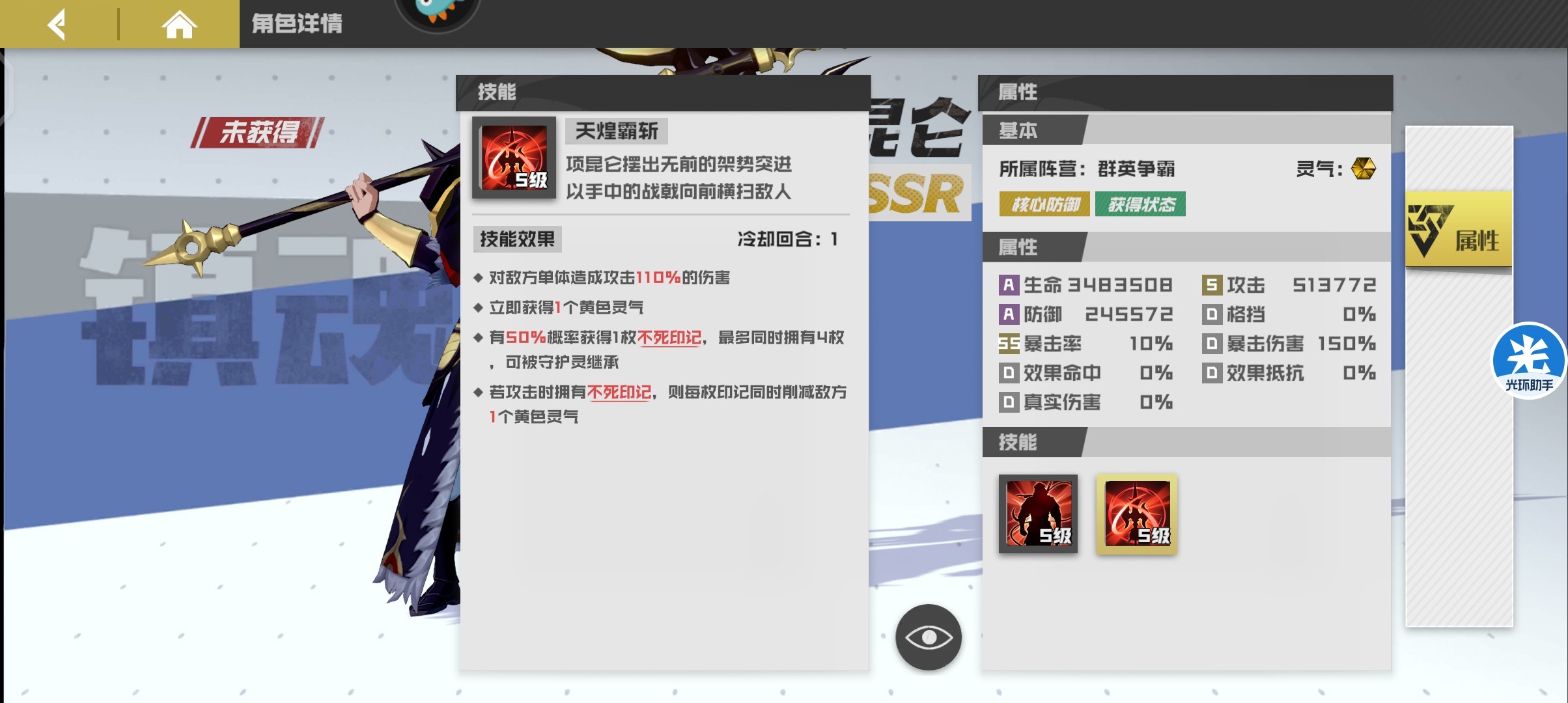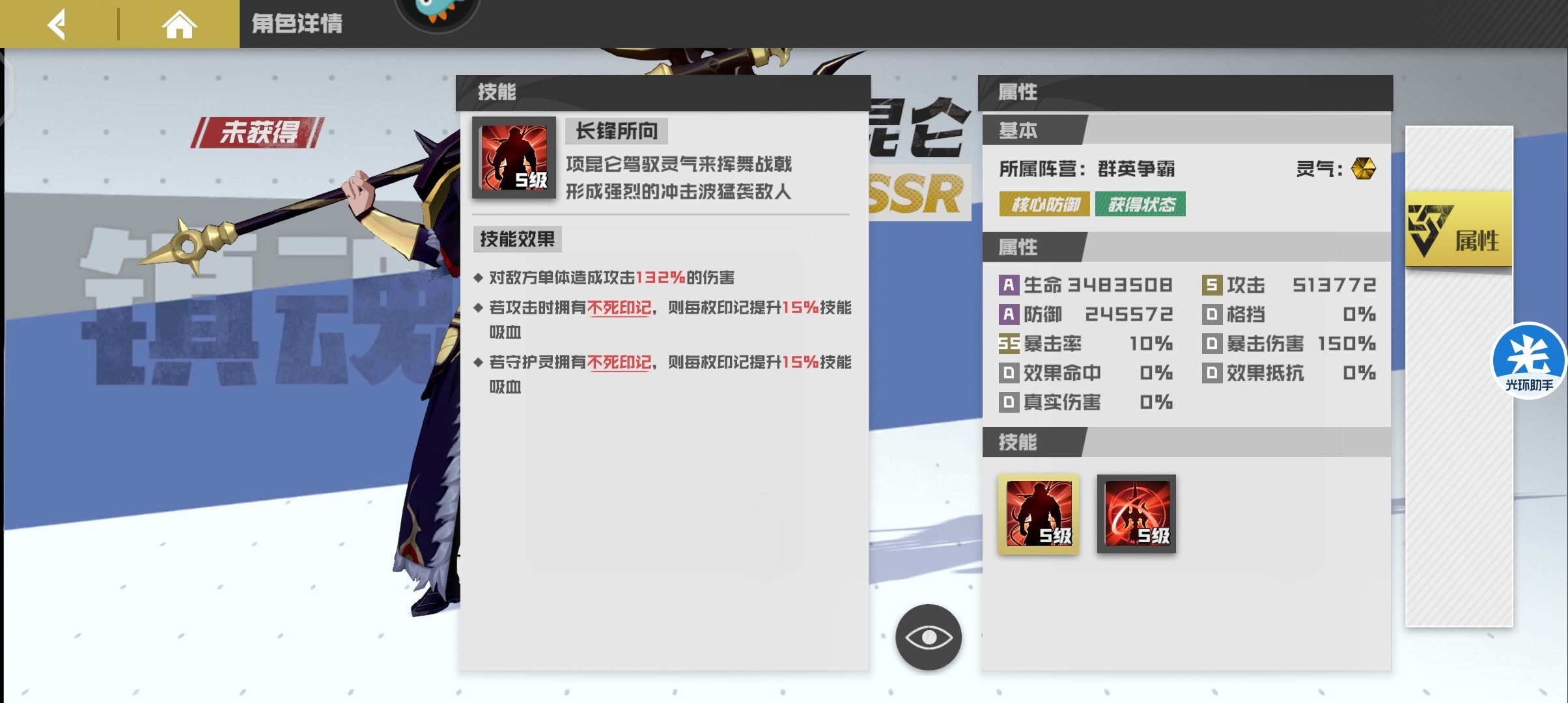 续航最强寄灵人,拥有高额的吸血以及伤害加成,被动不死印记配合项羽达到复活效果,拥有不俗的伤害同时拥有高回复高续航能力,搭配项羽作为当前最强防御组合。