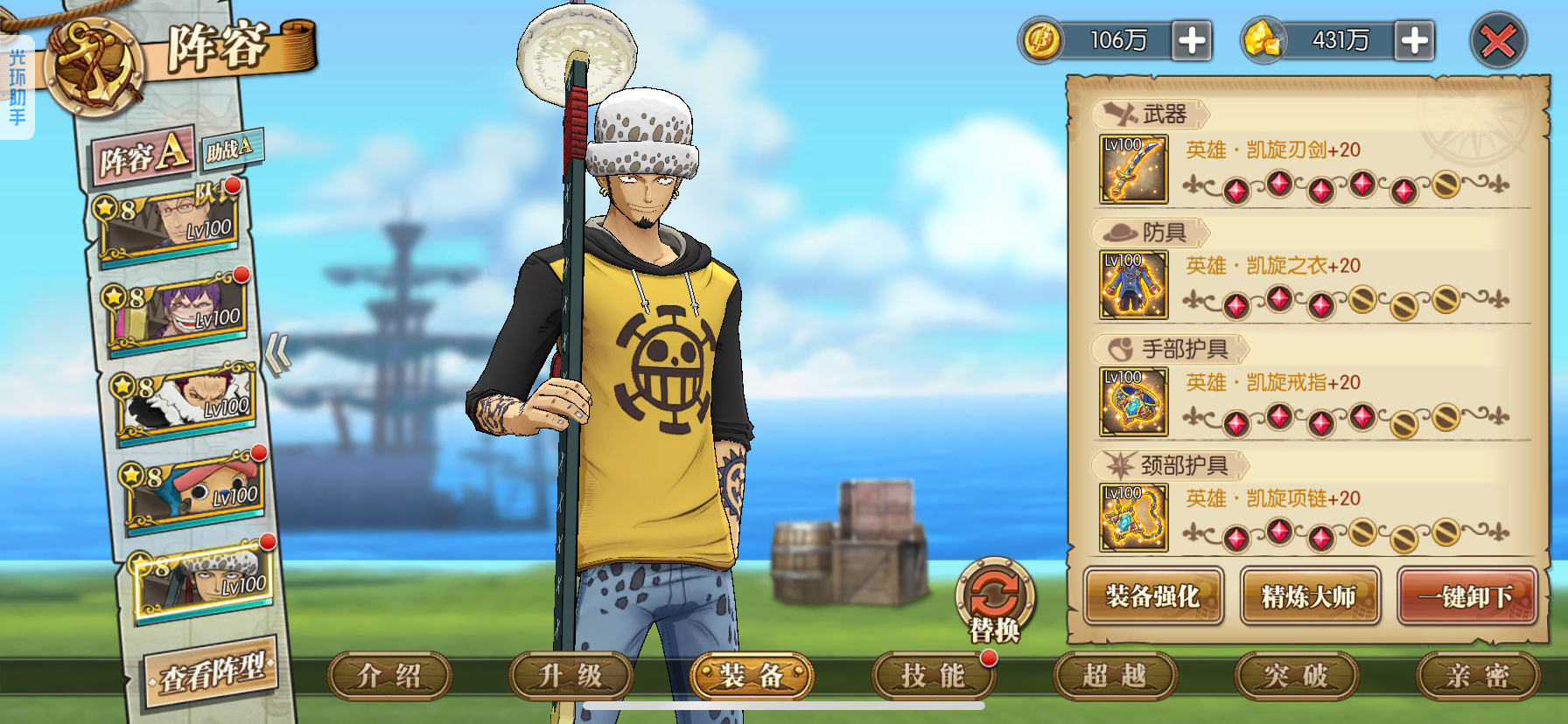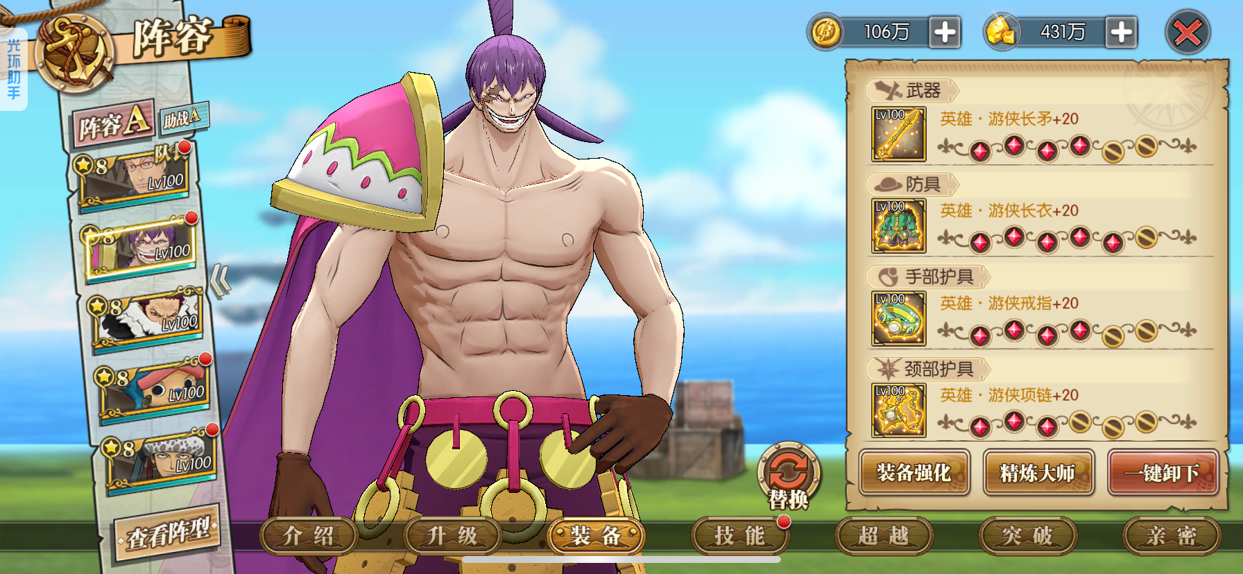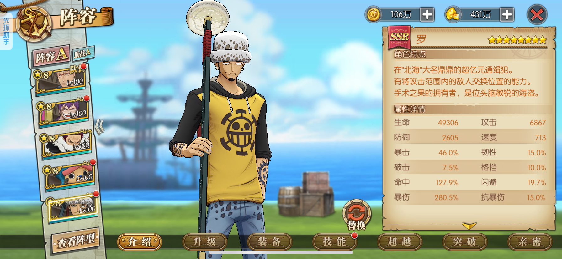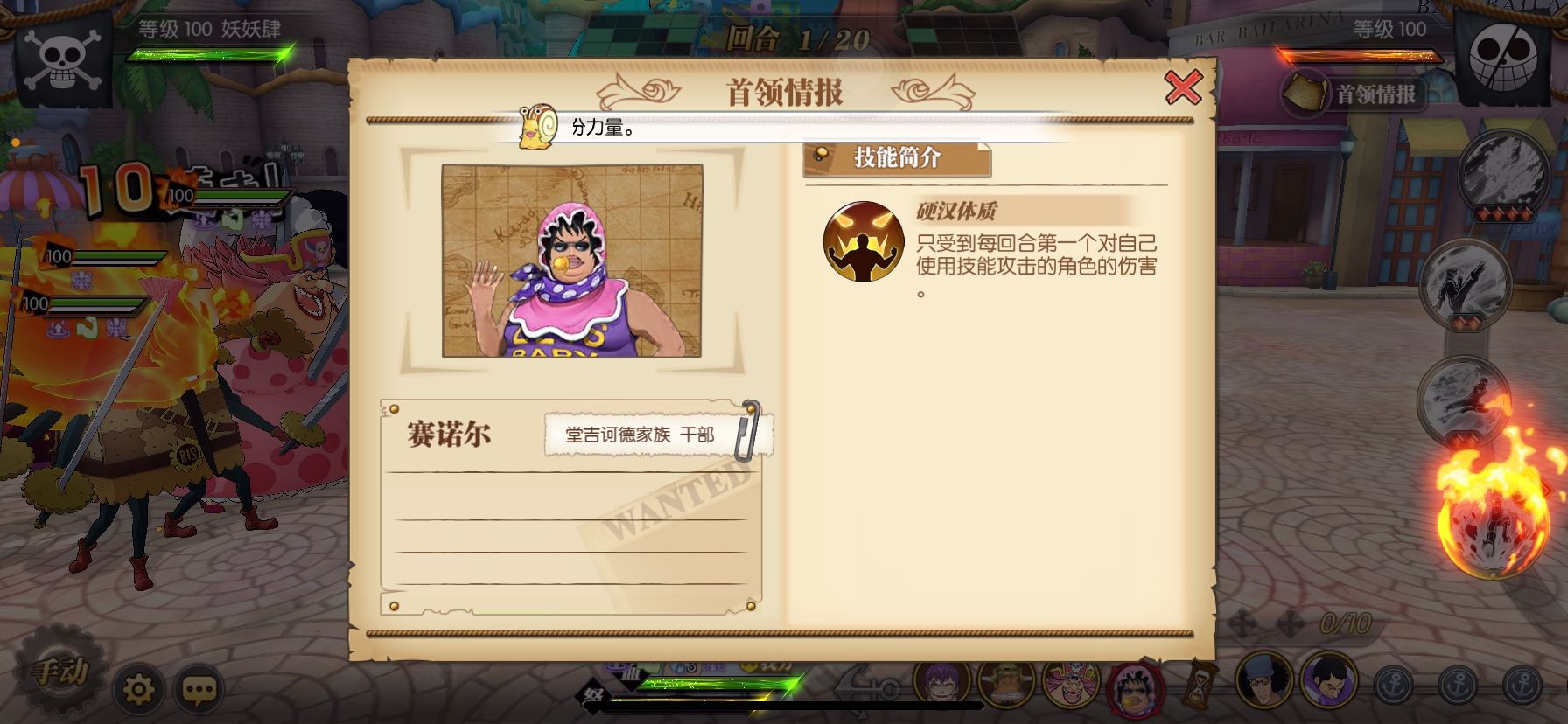 打法攻略:让对位的输出的人物先对位打boss,其他人物利用群伤技能先把小兵击杀,在没有黄盾出现的回合时,仅可能多技能输出,其次最好上一个乔巴或小马哥进行群体回血,boss出现黄盾时,他的被动流血效果与群伤伤害高,需要有奶爸进行持续补血。前排大妈尽量安排肉装备,顶住boss终结技能伤害,基本能自动通关啦。