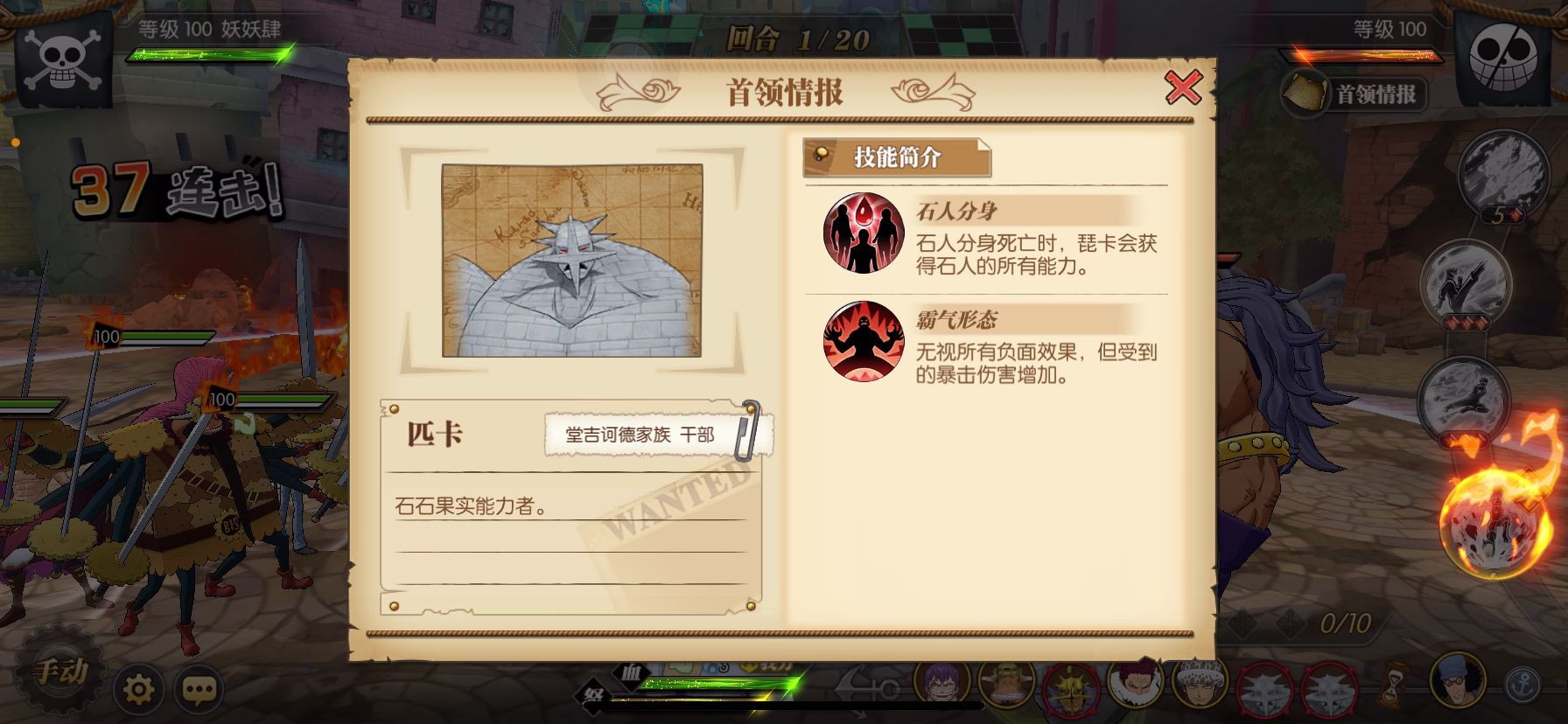 打法攻略:助阵人物推荐上奶昔、没有就上大熊或回血人物。主要是解控眩晕效果,其次是 石头人可以使用旧罗进行换位打法,如果没有旧罗就先把2个石头人击杀再打复活后的武装色后匹卡,复活后的匹卡不吃属性伤害与真实伤害,就是靠磨血的来打,不知道新世界鹰眼出来后,会不会吃斩断的效果,有卡二尽量让卡二被打乱站前排,卡二能免疫3次技能攻击,其次就看其他人员的技能输出技能磨血攻击的打法。攻击伤害不够就吃药打。打复活的卡二重要是看人物被打乱的站位,比较如果是脆皮被打乱站前排,20个回合的磨血打法肯定是打不过的,所以这个除了看人物培养,更加是看打乱的站位情况,祝大家好运吧。