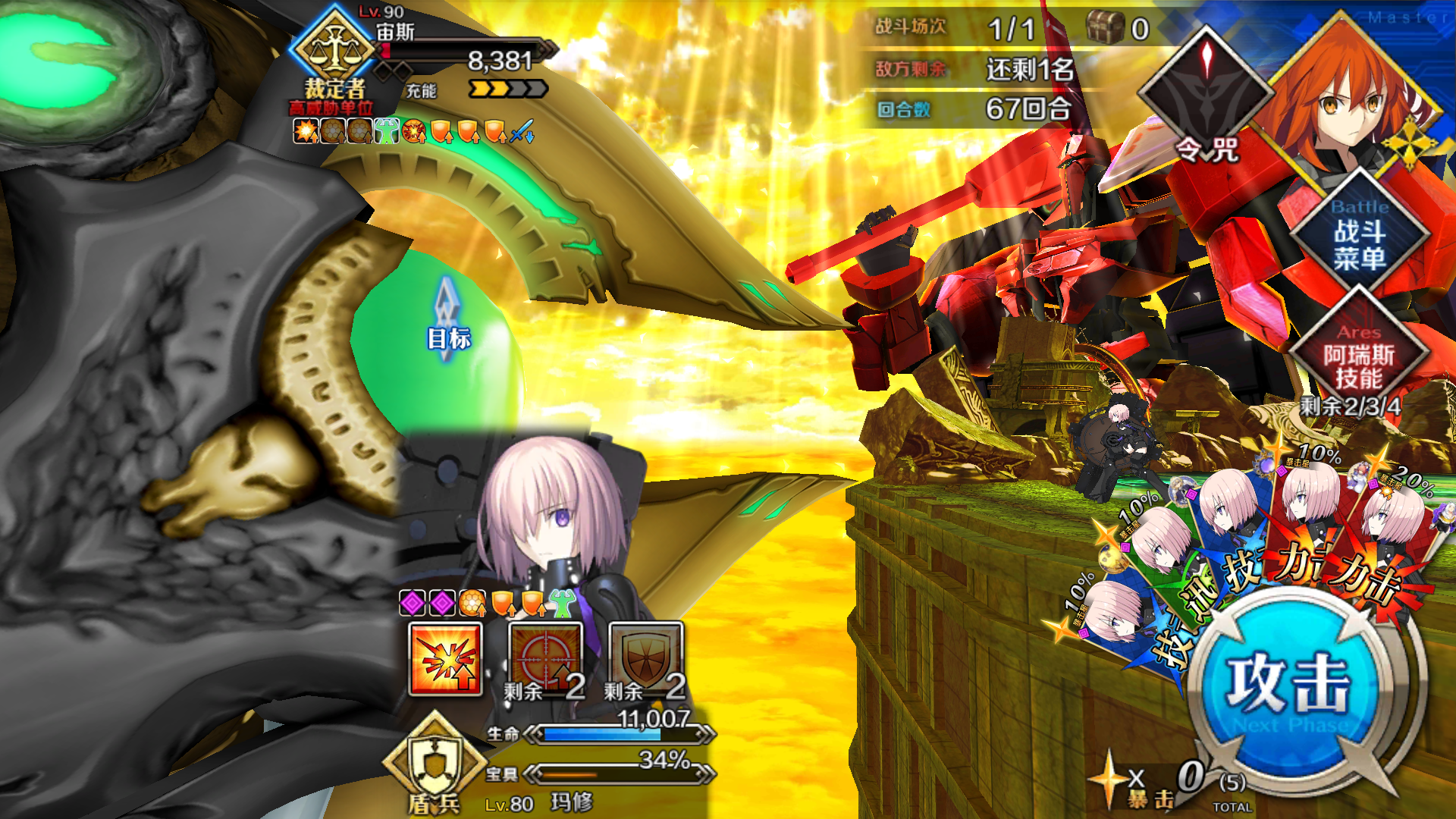 实在没无敌,阿瑞斯那边也cd了只有一个战续唯一一个容错率(当然也可以3令咒复活继续打)。系统也会为你减免一个弱体和加1000血,所以就算被宙斯暴击4000血然后一个红绿蓝又回1500血加上系统的1000回血,还是能抗住