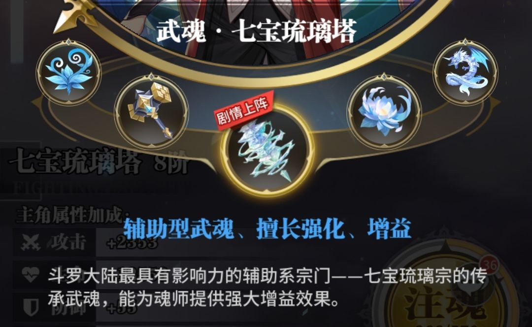 目前我的武魂选择的是七宝琉璃塔,我认为七宝琉璃塔的增幅更大,提升比较全面,适合强攻型阵容,可大量提高我方魂师的伤害,在输出上得到了大幅度提升。