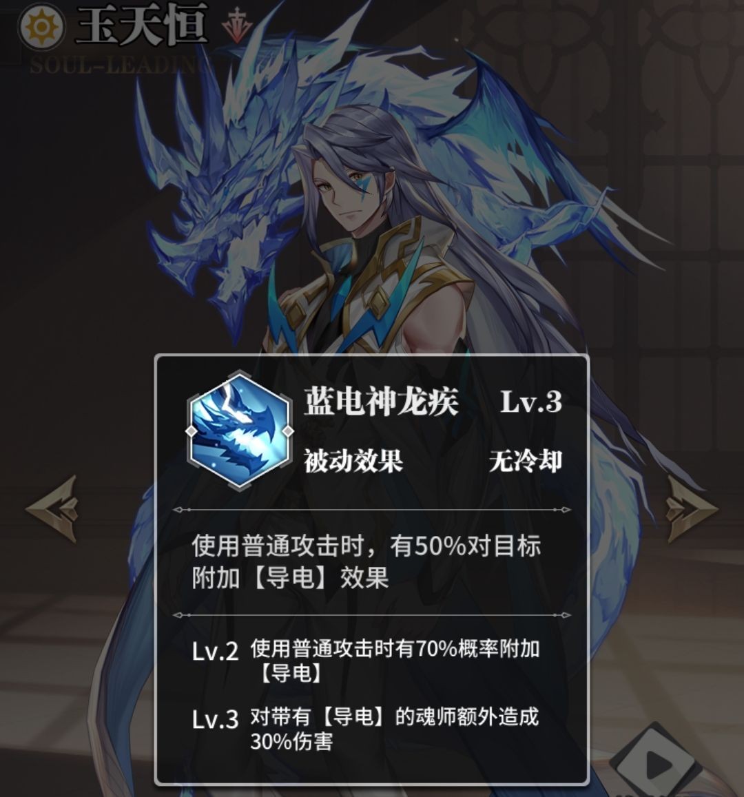 如果是大佬玩家主养光系,配合蓝电霸王龙武魂的玉天恒,普通攻击有70%的概率附加导电效果,加上主角魂技双层导电,对导电的魂师额外造成伤害,刷图优先选择蓝电霸王龙。