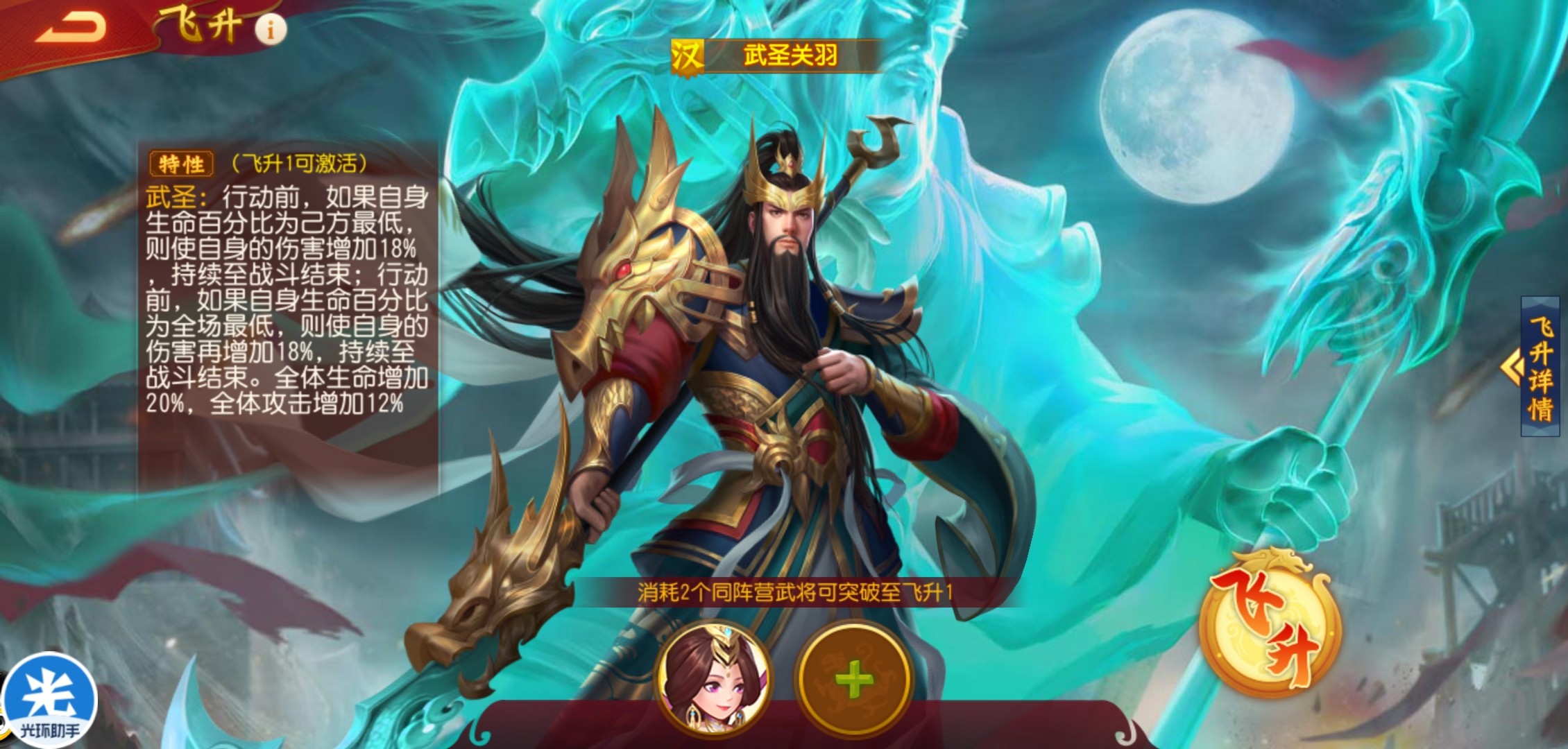 并且汉将的提升和晋国金将一样,并不规定必须是相同的武将才能飞升,就比如飞升武圣关羽同样可以消耗凤仪貂蝉或者天义太史慈。