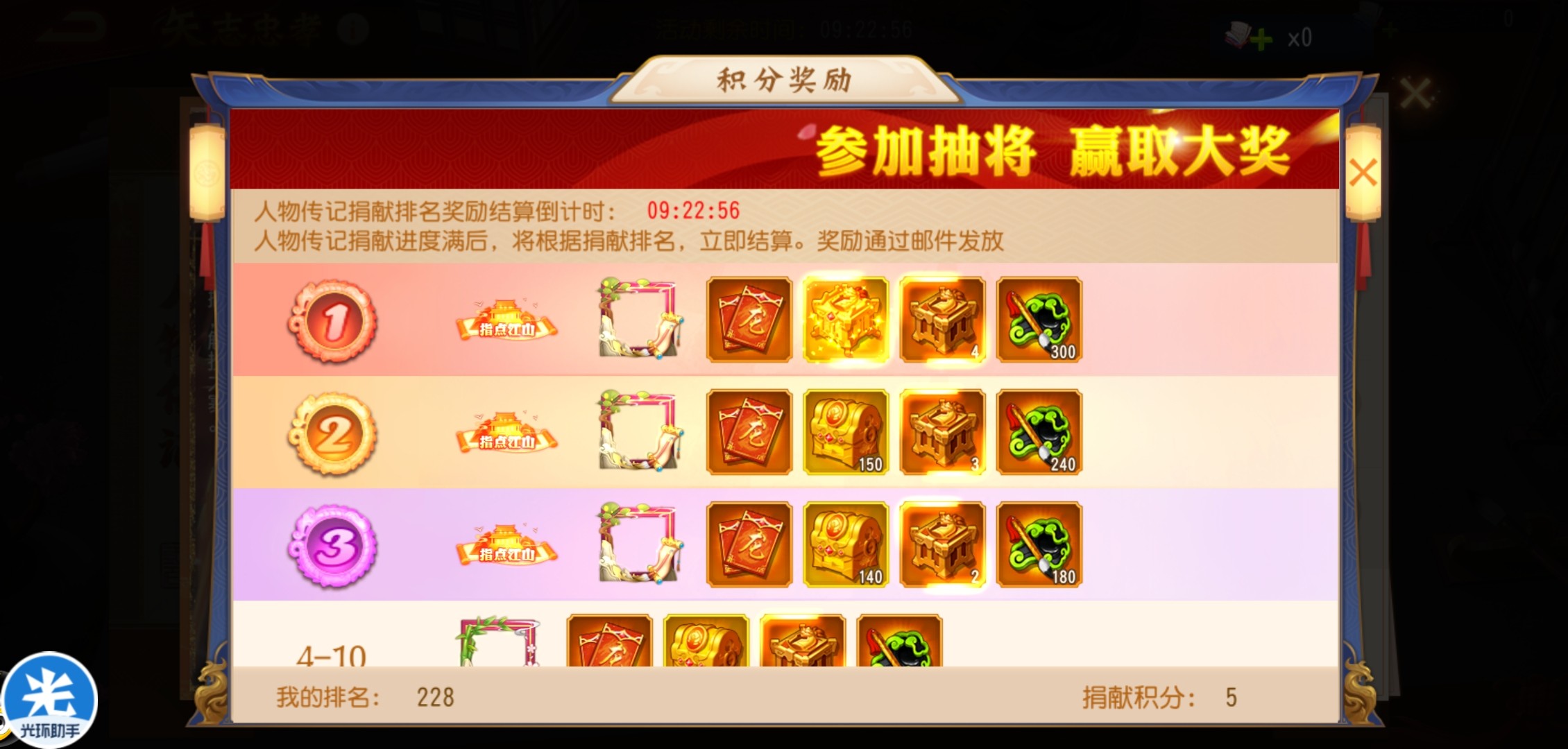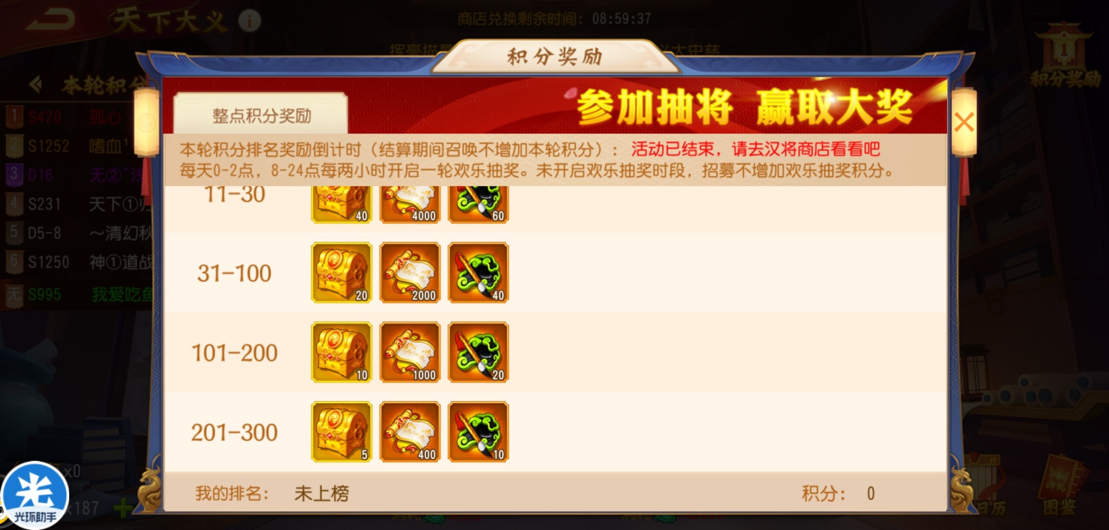 由于每一场的积分情况不同,所以排名也是变化的。目前平民玩家最好是利用好玉壁资源,争取上200排名。如果实在没有那么多的玉壁资源,也可以争取上300名获得奖励。