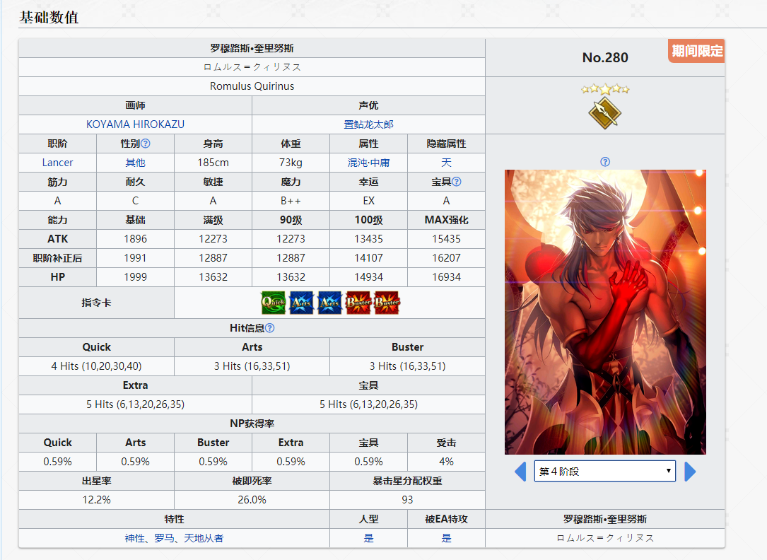 神祖基础NP率为0.59%,指令卡配卡是二红二蓝一绿的标准红卡光炮配卡,红卡3hits、蓝卡3hits、绿卡4hits,综合hits和基础NP计算罗穆路斯的NP率为一般水平的从者,不算优秀但是也不是太低,中规中矩。