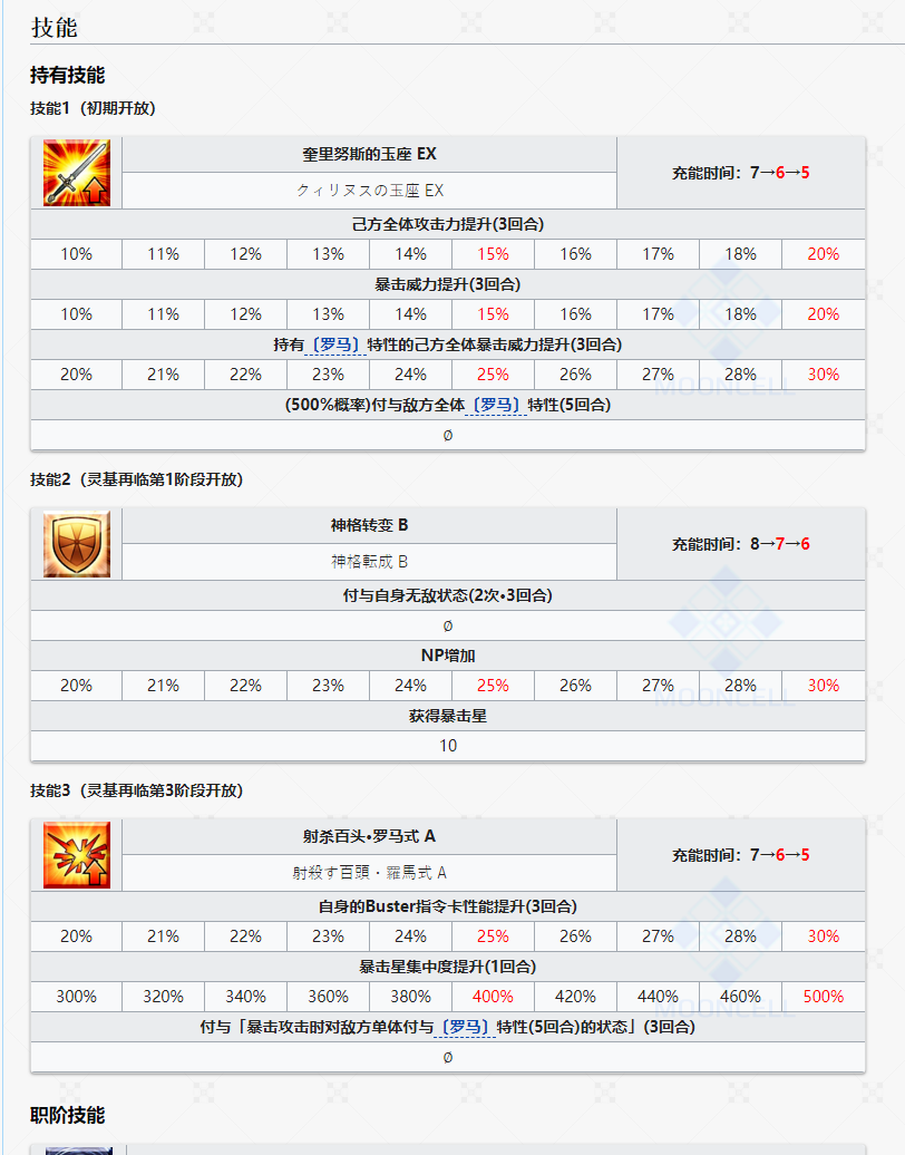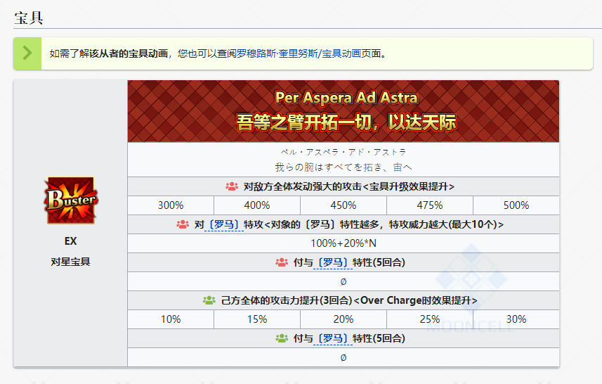 宝具后置带有赋予敌人「罗马」特性五回合+己方全体三回合10%~30%的攻击力提升(随宝具过充提升而提高)+赋予己方全体五回合「罗马」特性。