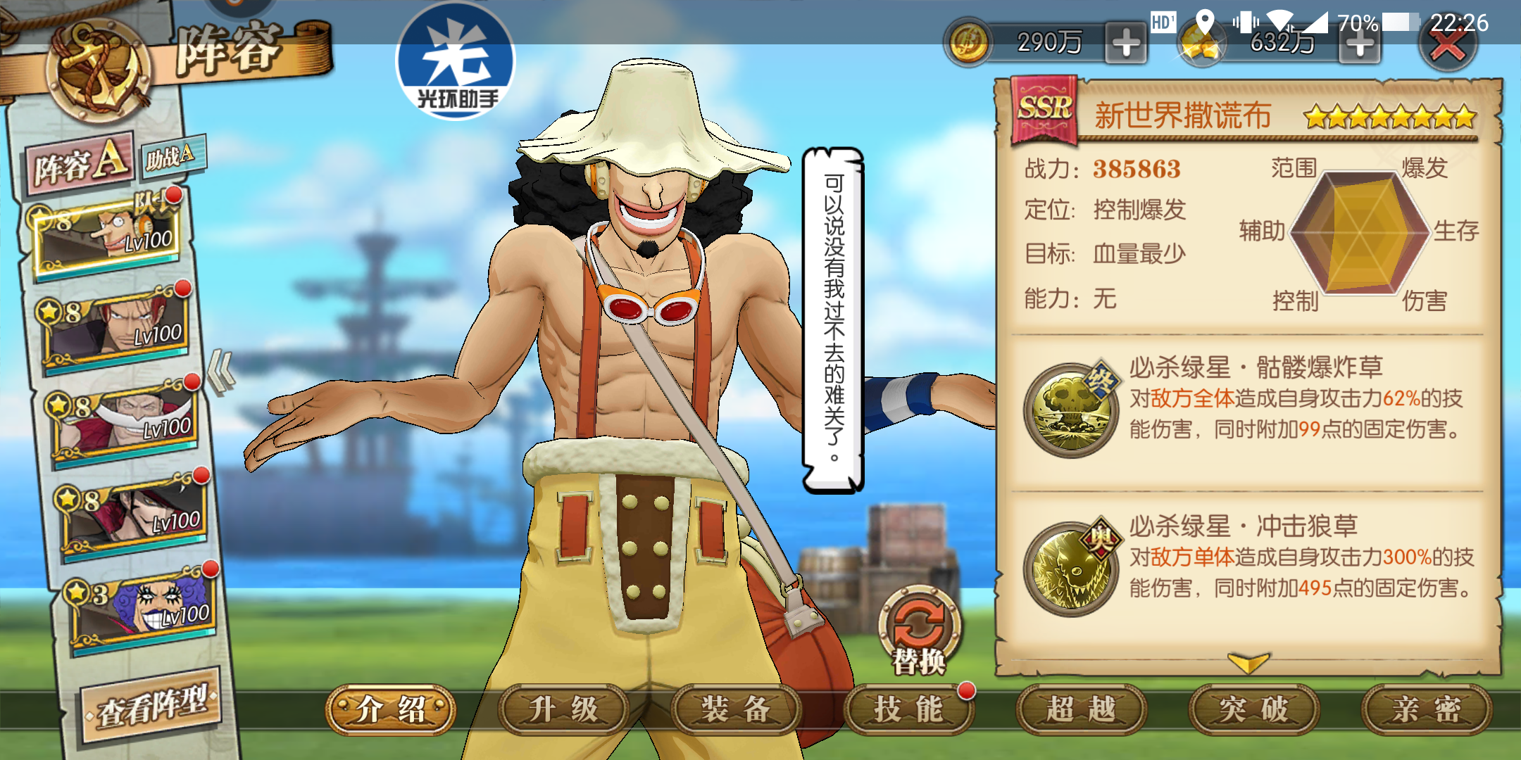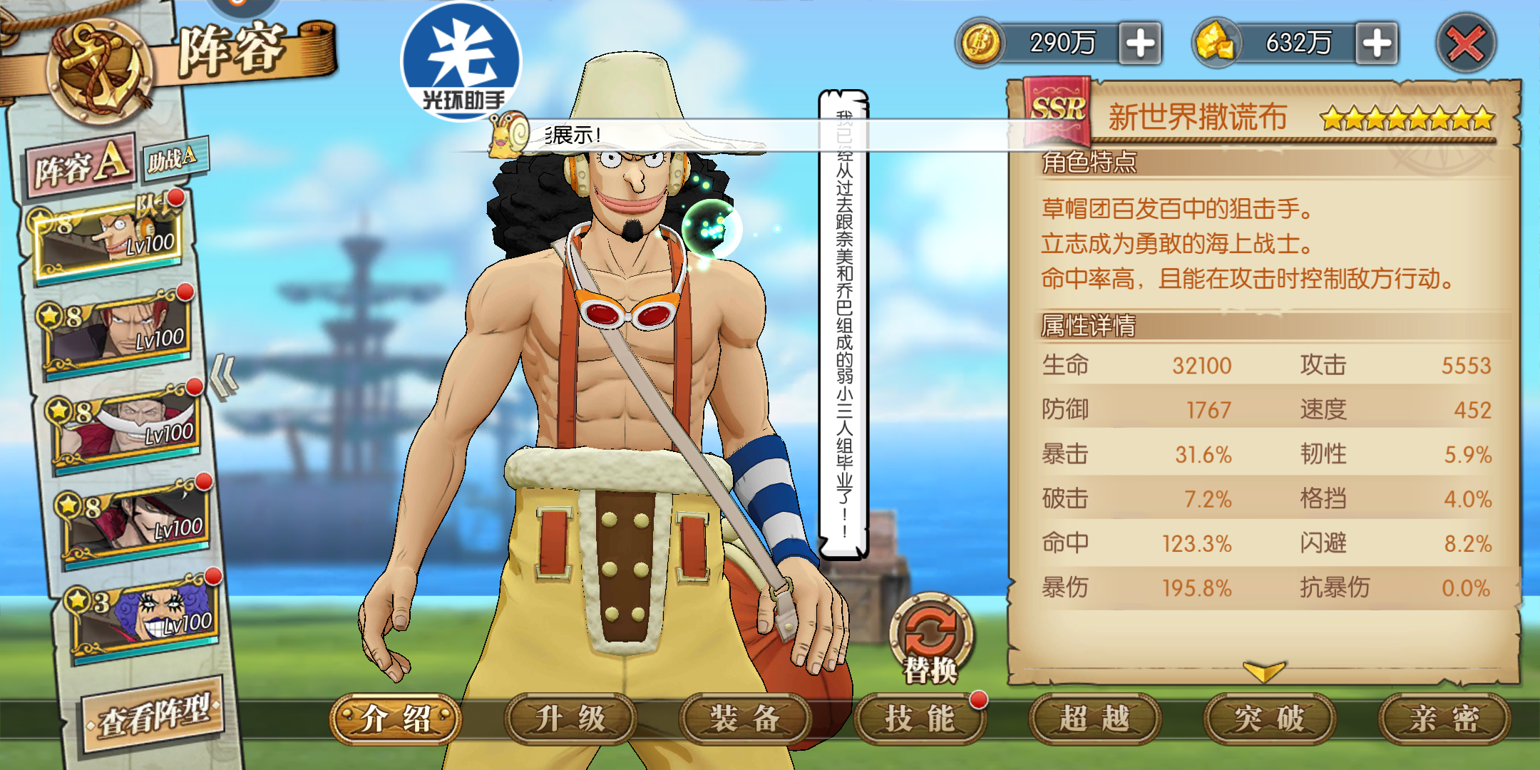 伤害,速度,怒气三控,sr罗宾是目前已知的,在天梯中曾活跃过的控制类角色(鹰眼等就不提了...),你可以等待ssr罗宾,但不能错过新世界乌索普!而且乌索普还免疫多项属性降低!