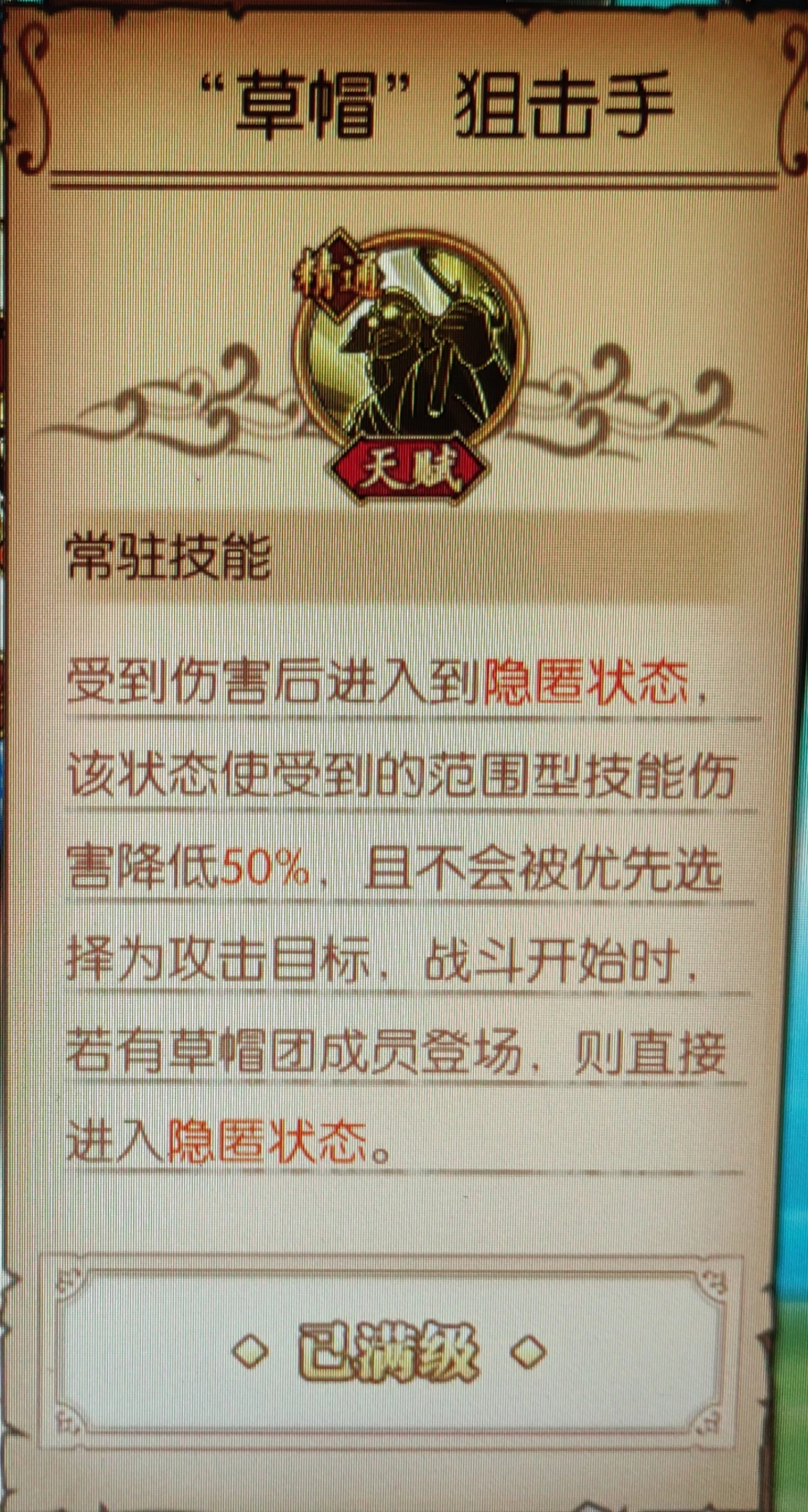 天梯实测:机制天赋里最优秀的天赋。不吃红发逆牙,减速。描述中不会降低的都是重要属性,是一个很长远的实用天赋。策划应该是综合后期会出现的限定,包括草帽团中乌索普的上场几率,给予的这个亲儿子般的天赋,保证了乌索普今后长久时间内登场的几率。