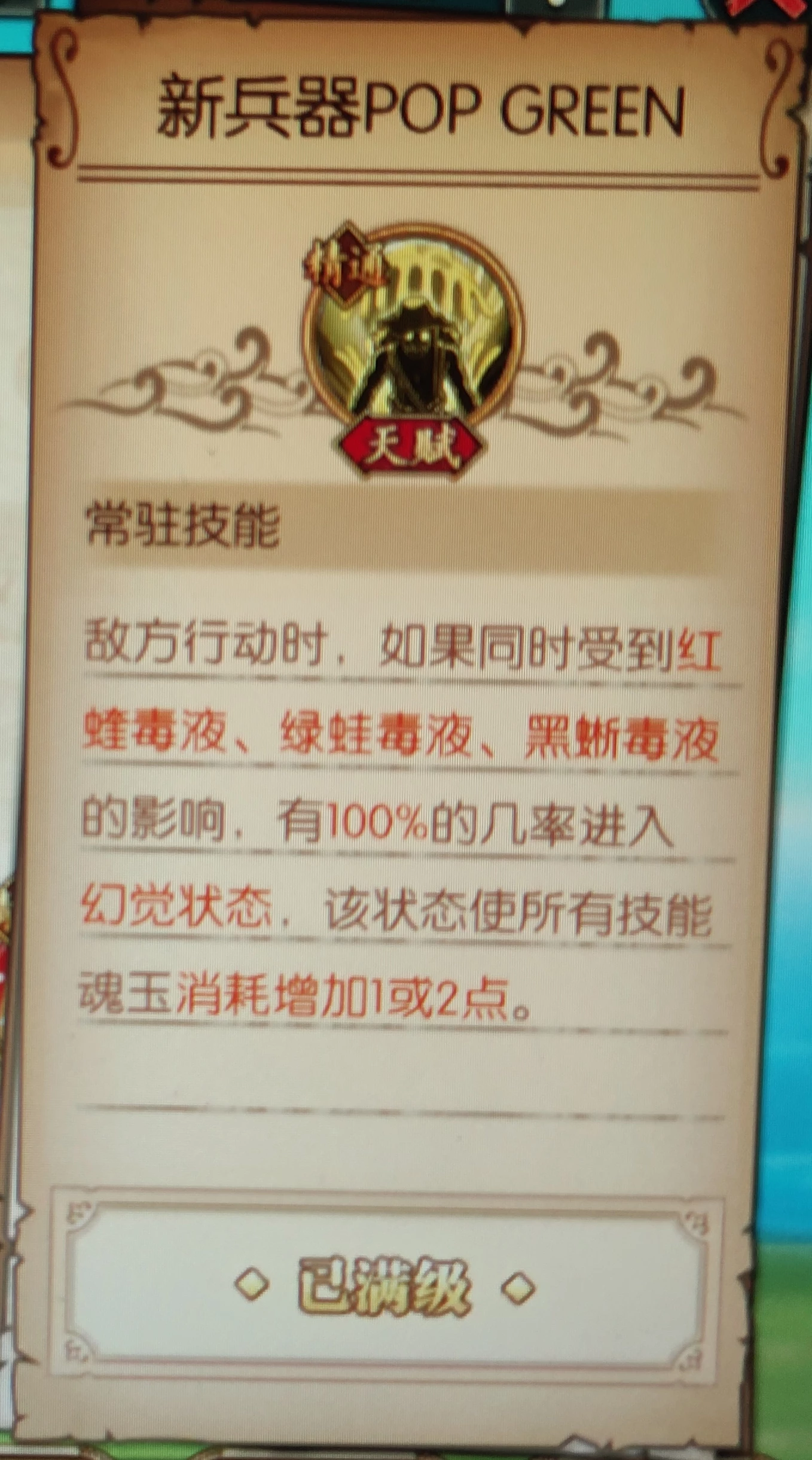 天赋等级:白爷同级天赋,三毒幻觉天赋配件,中等偏下。