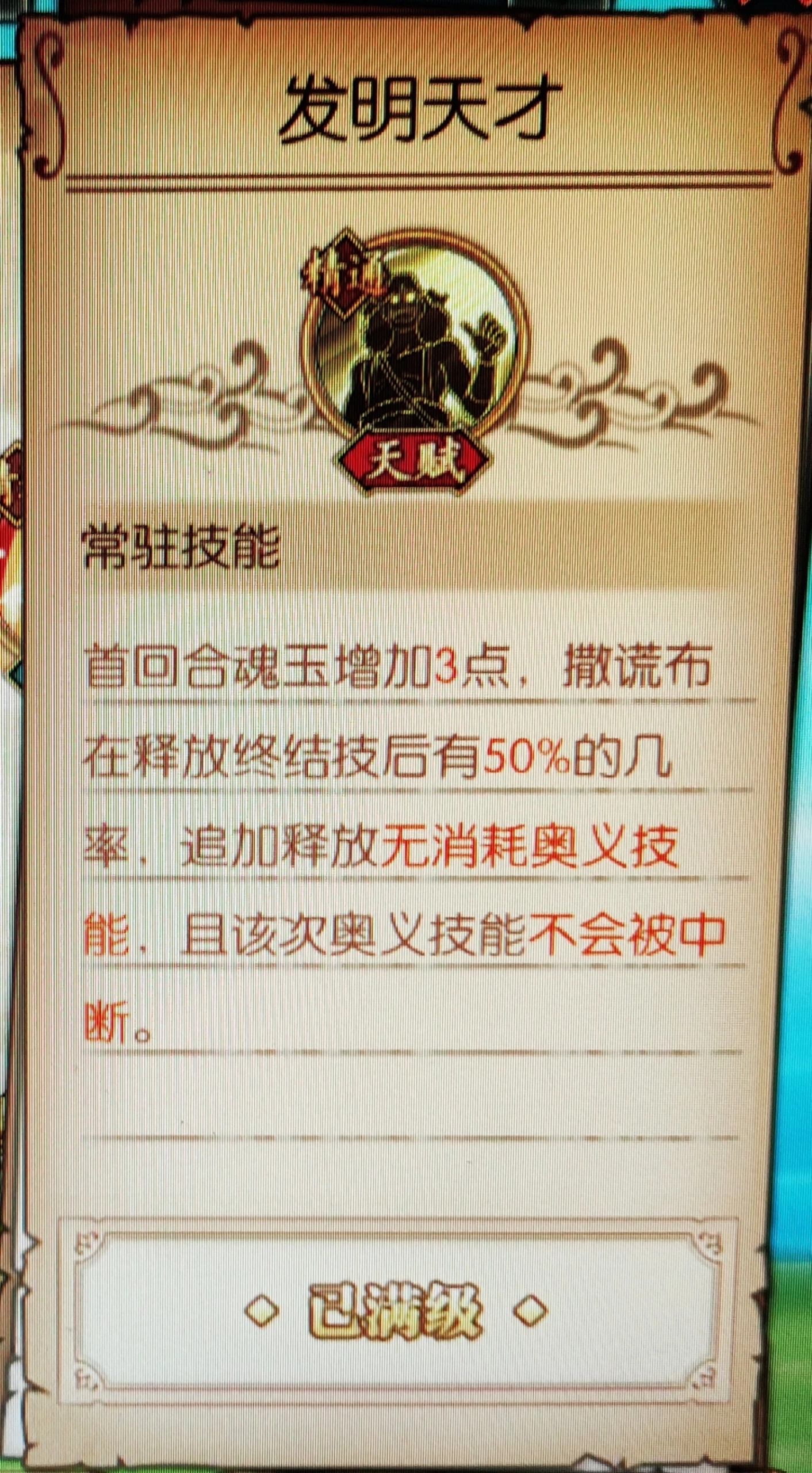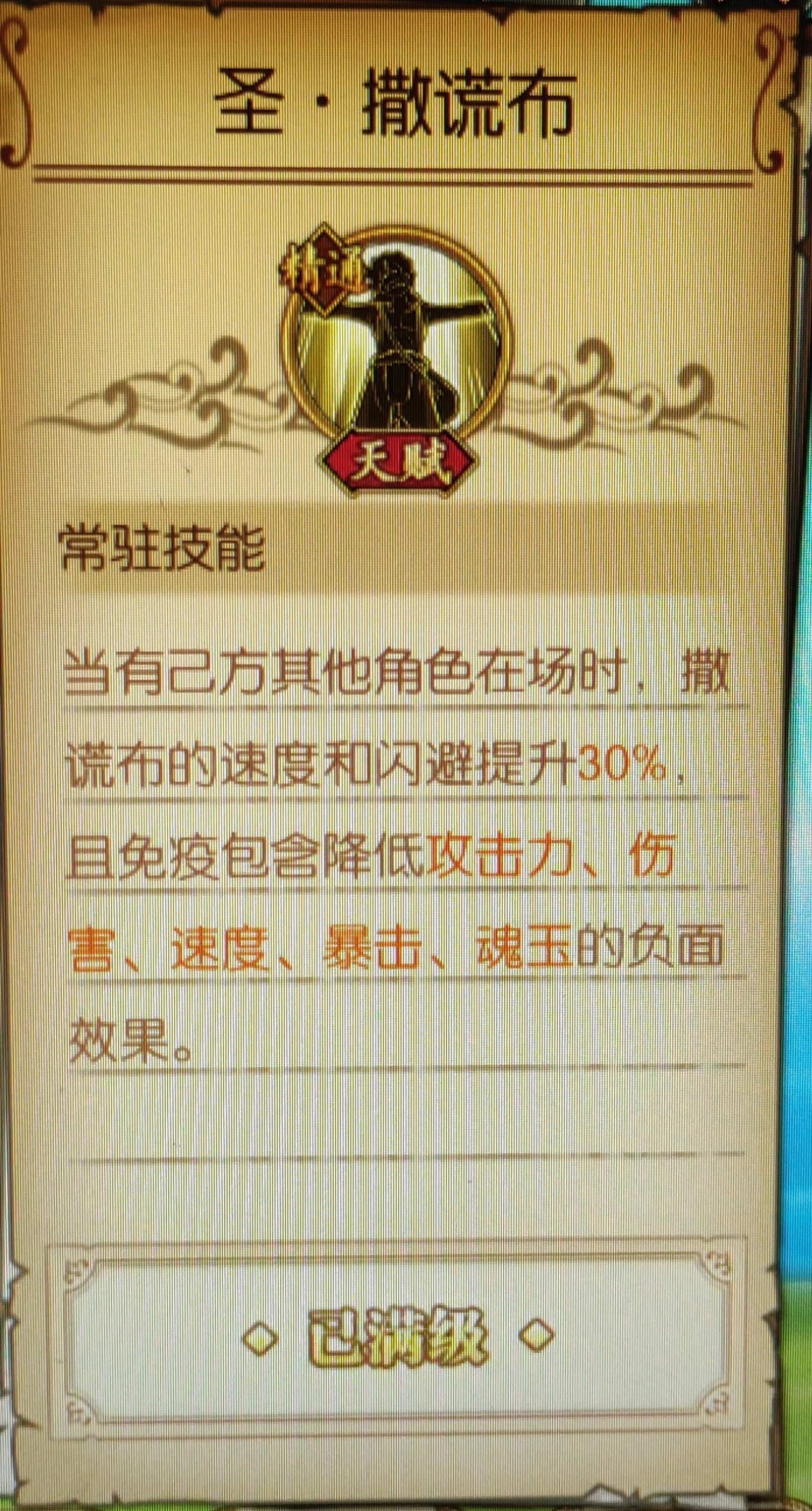 天赋等级:保命天赋,可能是最近复活类天赋过多,把sr六星保命天赋改成这样。一般。