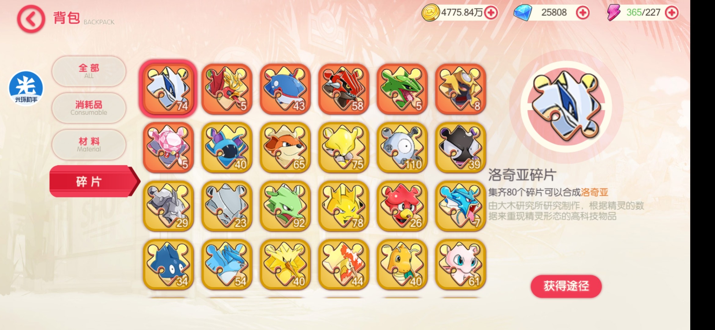 接着是关于贫民拿神兽的机会。(超梦,超级裂空座之类的就不说了,和咱们关系不大。)比如说凤王,大家看,我已经有几片凤王了,但是我没有参与过充钱送两片凤王的活动,这些都是在石英大会排名第二得到的(白嫖真香)。而且现在洛奇亚、大鱼、老固、公主(这个有点难)都可以在商店里兑换了,只要坚持下来,都有白嫖的机会,我的洛奇亚碎片是从商店更新之后基本一天没有断过,在过几天就可以得到平民最好用的前排了。