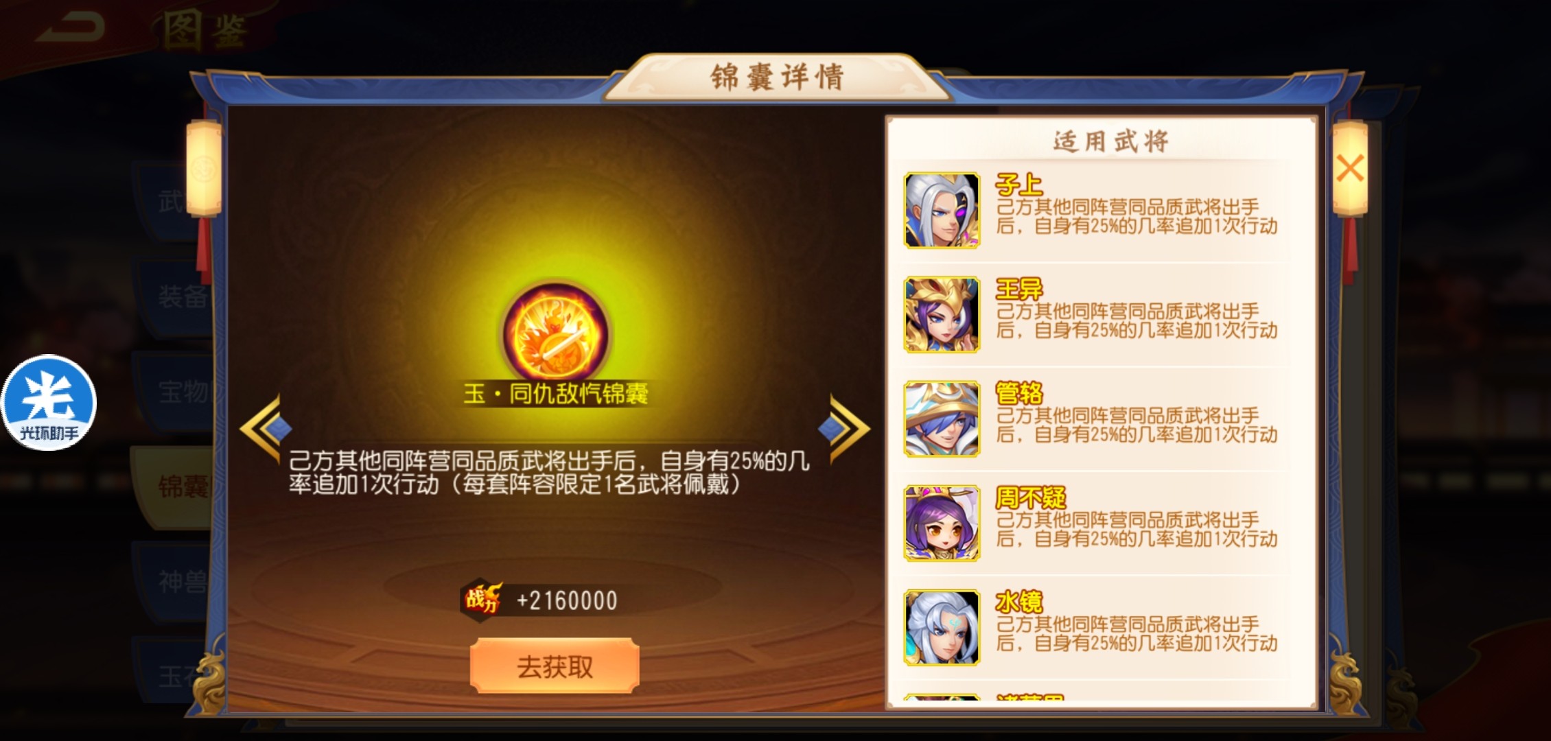而且天义太史慈直接克制晋国金将绿珠,如果上阵武将有绿珠,那每次太史慈行动后绿珠都追加一次普通攻击受到攻击的武将附加一层御甲,真的是瞌睡来了送枕头,这也让天义太史慈打个不停,直到打灭所有对手。