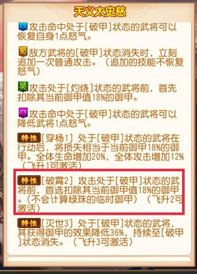 特别强调一点,关于绿珠临时御甲的描述,绿珠增加的临时御甲如果打不掉,比如有无敌盾时,会被天义太史慈添加一个破甲状态,这样就为天义太史慈创造了下一次攻击的条件。
