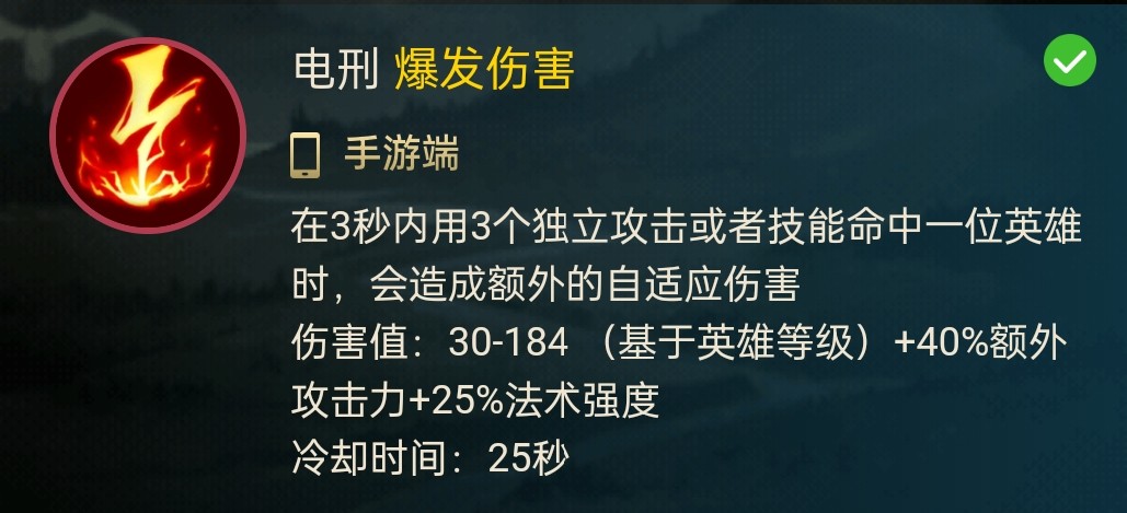 电刑是所有基石符文里伤害最高的,能够帮助某些英雄更好的打出秒人效果。同时电刑伤害不仅随着等级提升,而且有攻击力和法强双重加成,能从装备中获取不错的收益,后期也有大作用。缺点:电刑有25秒的冷却时间,这个cd比很多小技能冷却时间都长,所以在对线的时候无法频繁的打出消耗。电刑适用于大部分中单,刺客、爆发英雄优先选择!