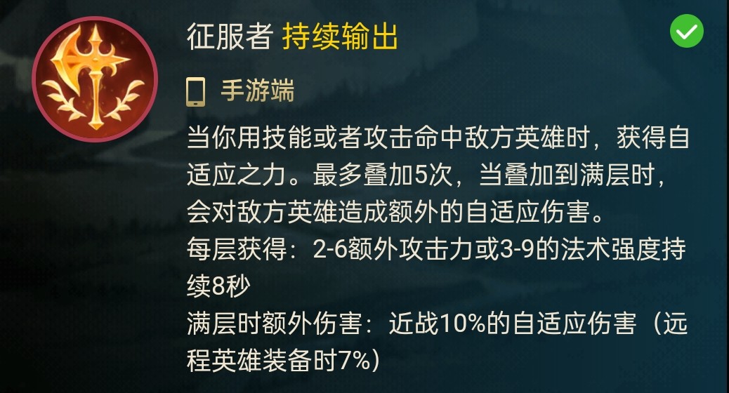 目前使用最普遍的一个基石,比端游更容易叠层数,是大多数战士和射手的首选。持续增长的伤害效果适合长时间作战。优点:每一层都有属性加成,叠满会有额外的伤害加成,叠满后伤害十分可观,能在长时间的团战对拼中占得优势。缺点:征服者的优势需要叠到一定的层数才能发挥最大的伤害,如果自身不够肉或者说在团战中被集火、被秒掉则难以打出伤害。