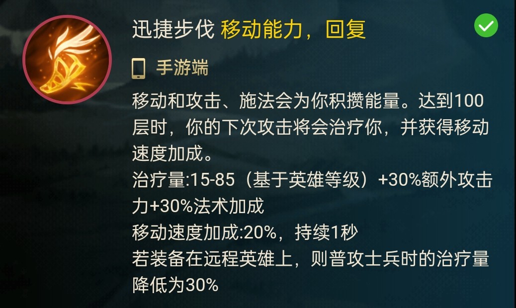 增加机动性和一定的回复能力,适合线上比较弱势没有回复能力的英雄,对线期间一定要多跑位积攒能量。优点:迅捷步伐的回复效果虽然不明显,但仍然是很多线上缺乏回复手段英雄的福音,触发条件简单打小兵也能触发,累计回复量还是挺可观的,同时还有移速加成效果,很适合一些缺乏突进的英雄。缺点:迅捷步伐没有任何的伤害加成,对英雄本身伤害要求比较高。